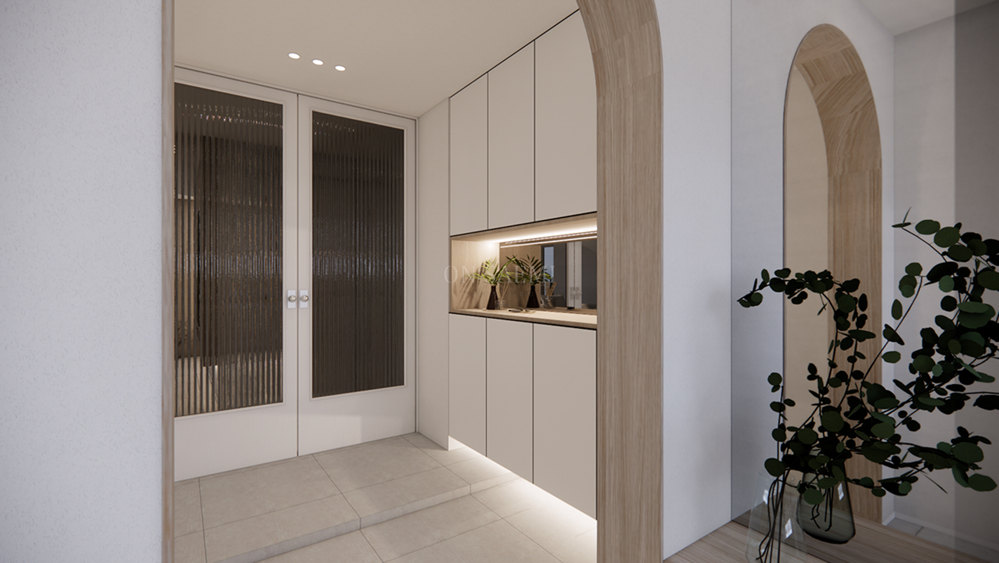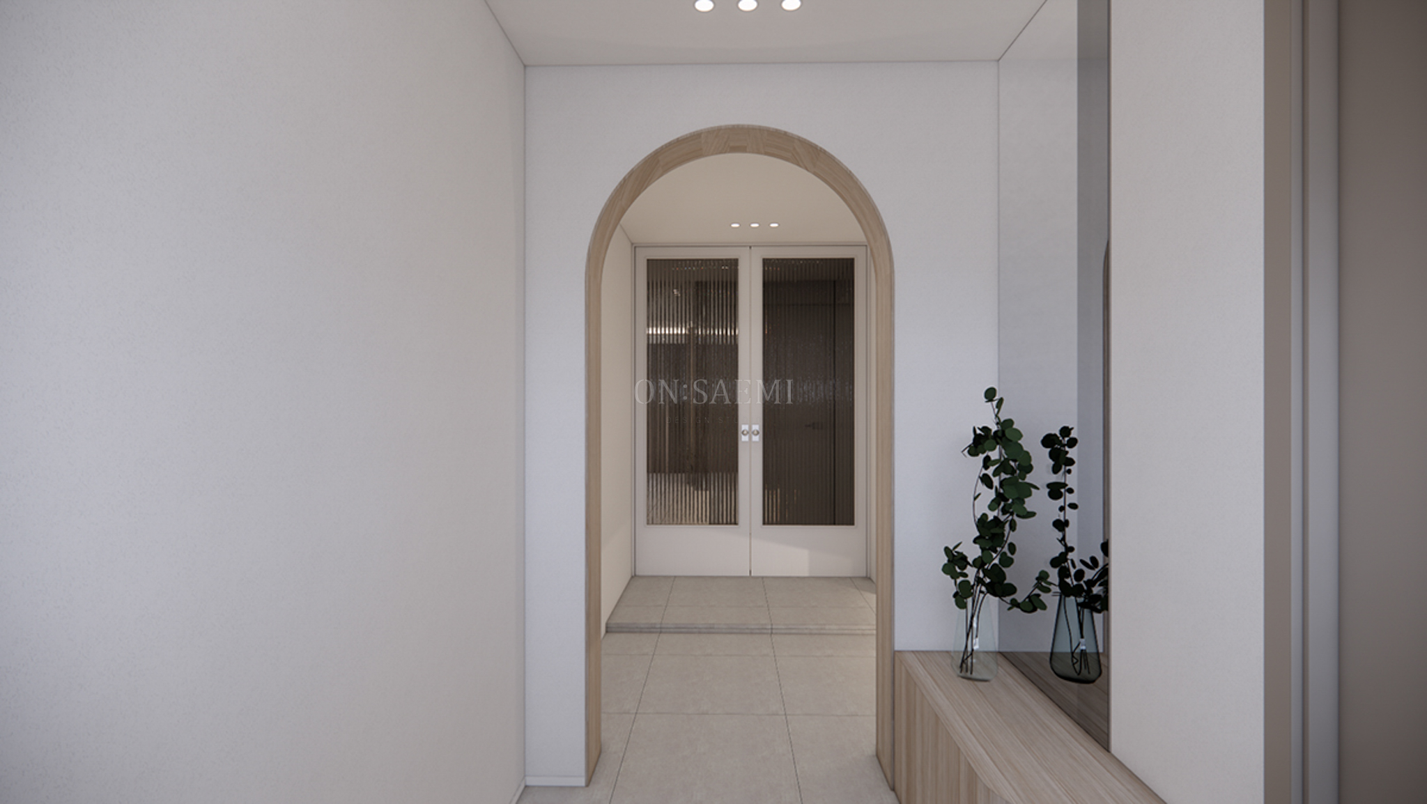 현관 _ 기존 중문을 철거하고, 아치형 게이트를 설치한 후 우드 필름으로 마감하여 따뜻하고 세련된 분위기를 더했습니다. 현관 옆에는 신발을 편하게 신을 수 있도록 붙박이 소파를 배치하고, 거울을 함께 설치하여 포인트를 주었습니다. 신발장은 화이트 장과 가운데 우드 선반으로 제작하여 차키와 오브제를 놓을 수 있는 공간을 만들었고, 거울 마감을 통해 같은 구조에서 넓어 보이는 효과를 주었습니다.
