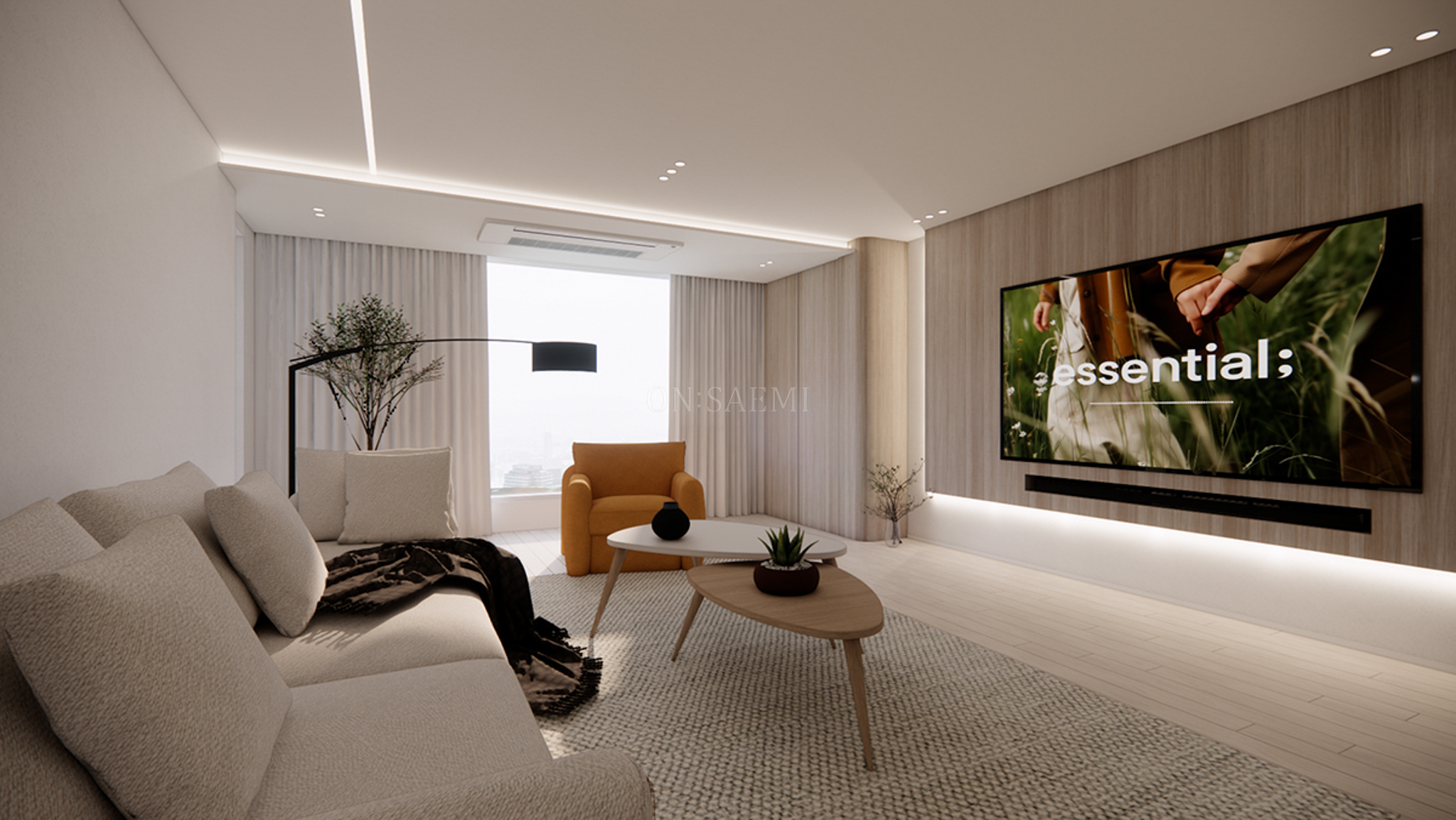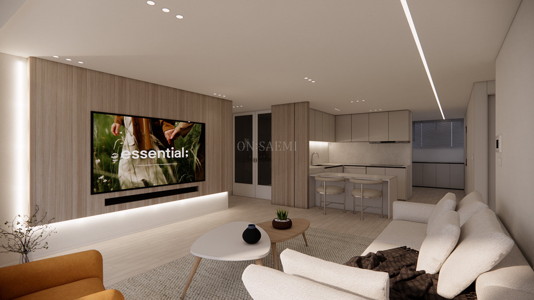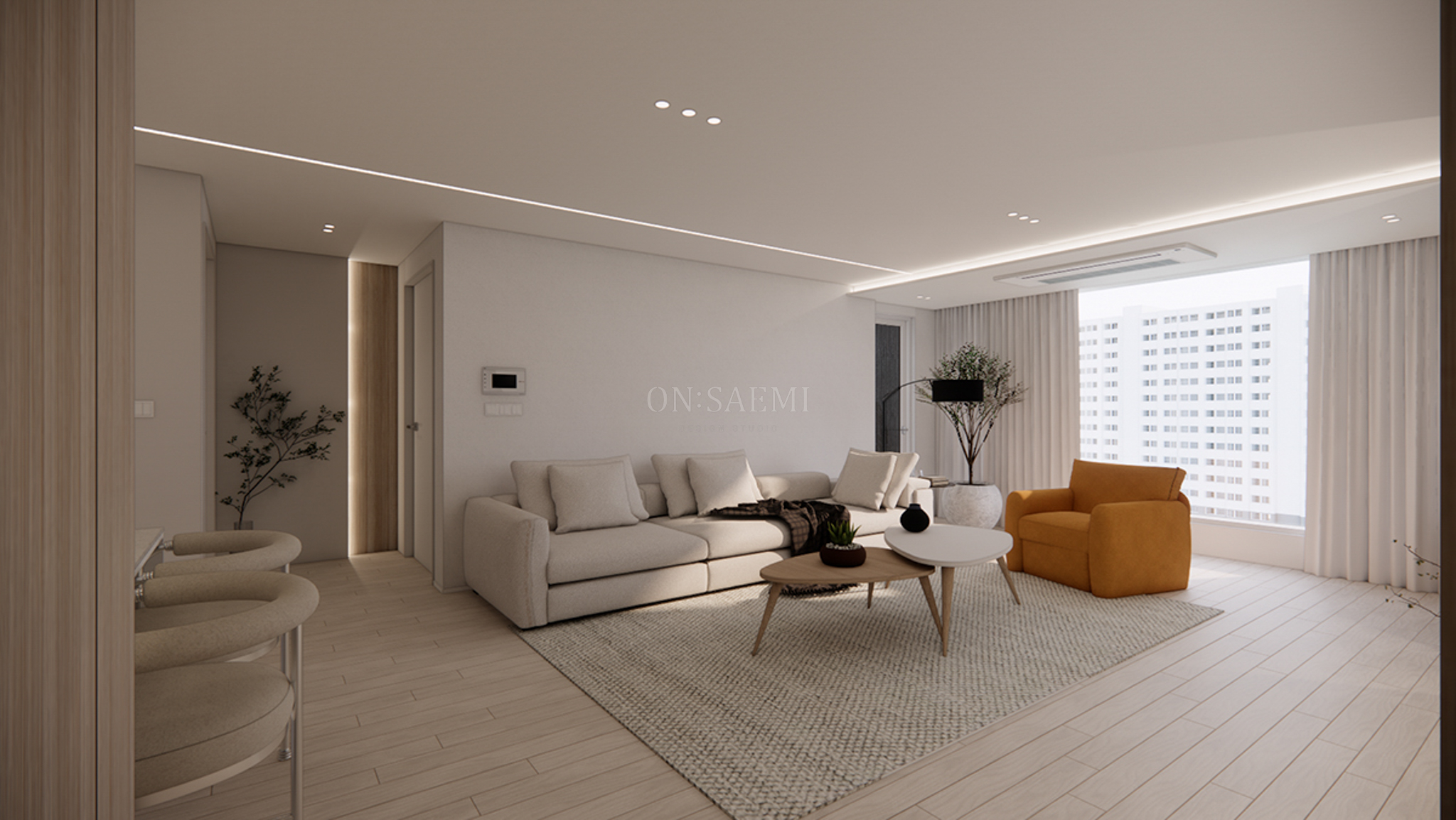 거실 _ 아트월 부분은 우드로 마감하여 자연스럽고 따뜻한 느낌을 주고, 스피커 부분은 매입 시켜 깔끔한 디자인을 완성했습니다. 기존 기둥 벽은 라운드 형태로 시공하여 부드러운 곡선을 강조했으며, 거실 홈바는 커피 머신을 놓을 수 있는 가구장을 제작하여, 전체적인 톤을 우드 필름으로 맞춰 수납과 디자인의 통일성을 높였습니다. 이로 인해 공간은 더욱 아늑하고 따뜻한 분위기를 자아내며, 차분한 느낌을 더했습니다. 또한, 천장은 기존 우물천정을 없애고 깔끔하게 마감하여 더욱 깨끗하고 넓은 공간을 만들어주었습니다.