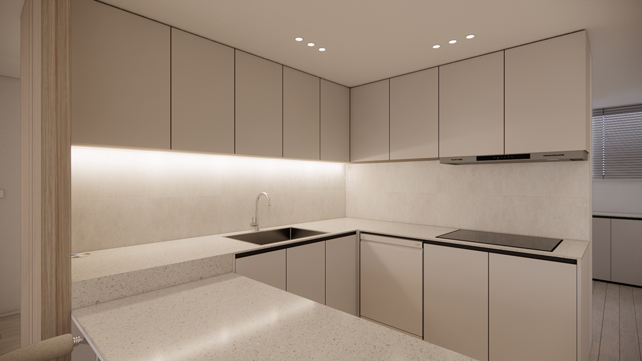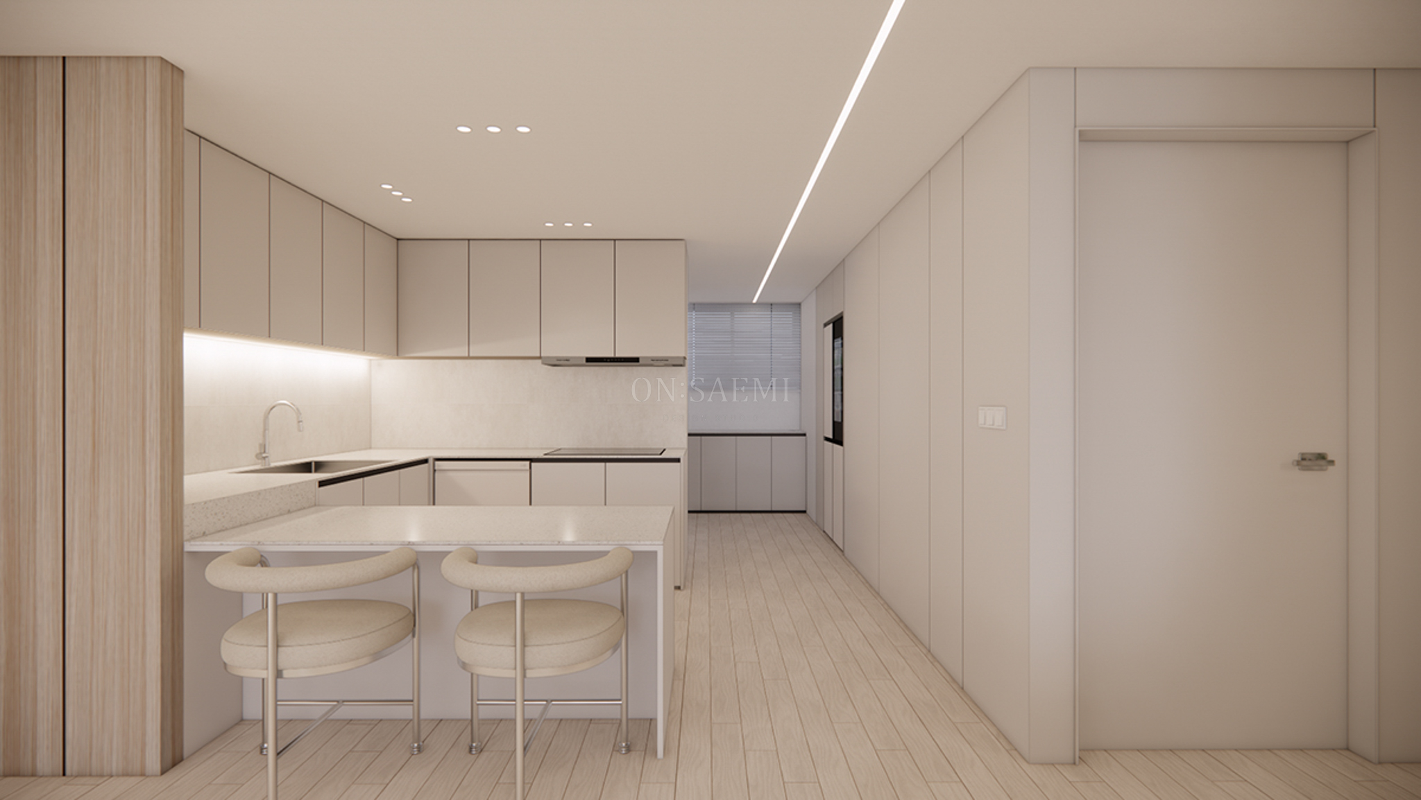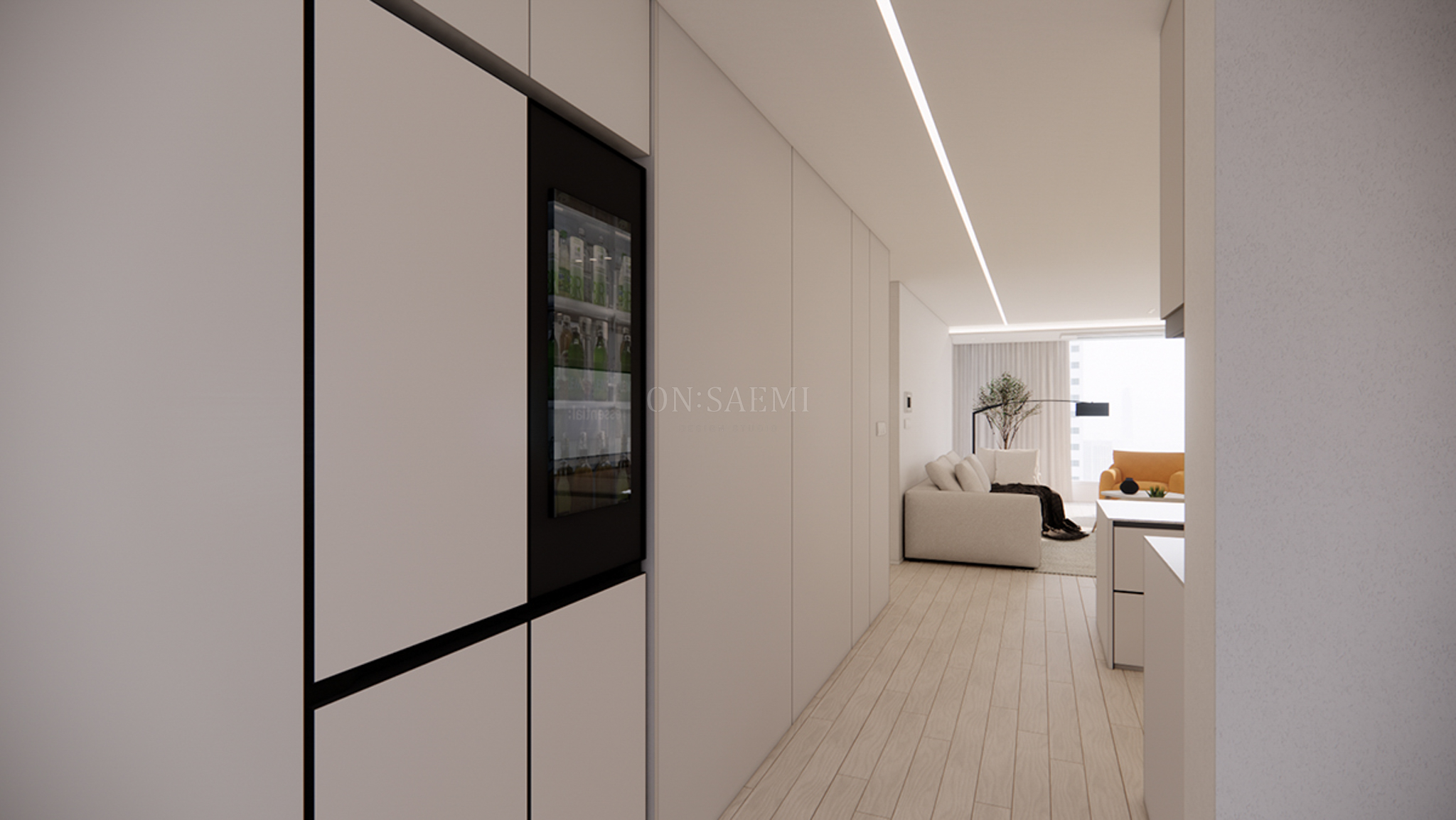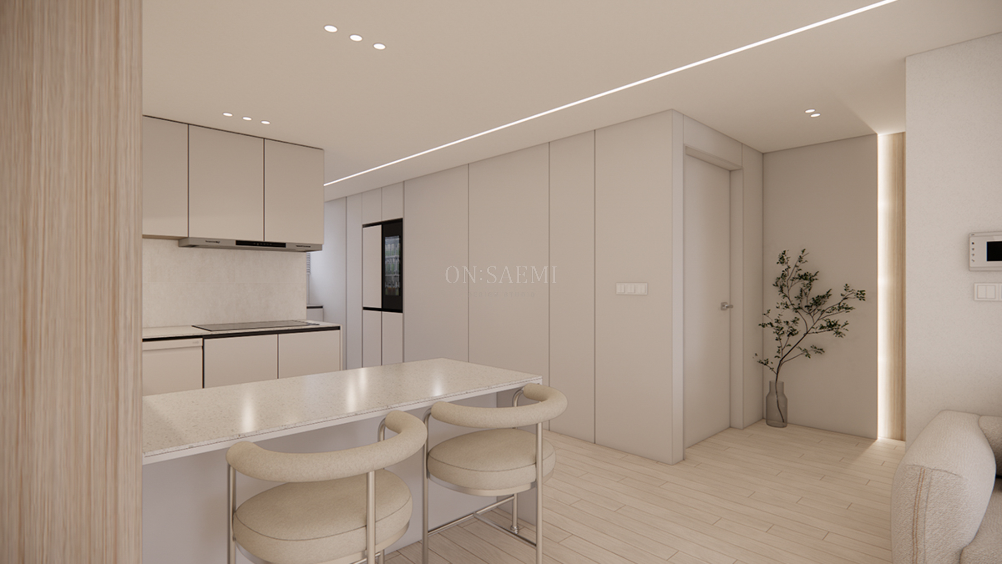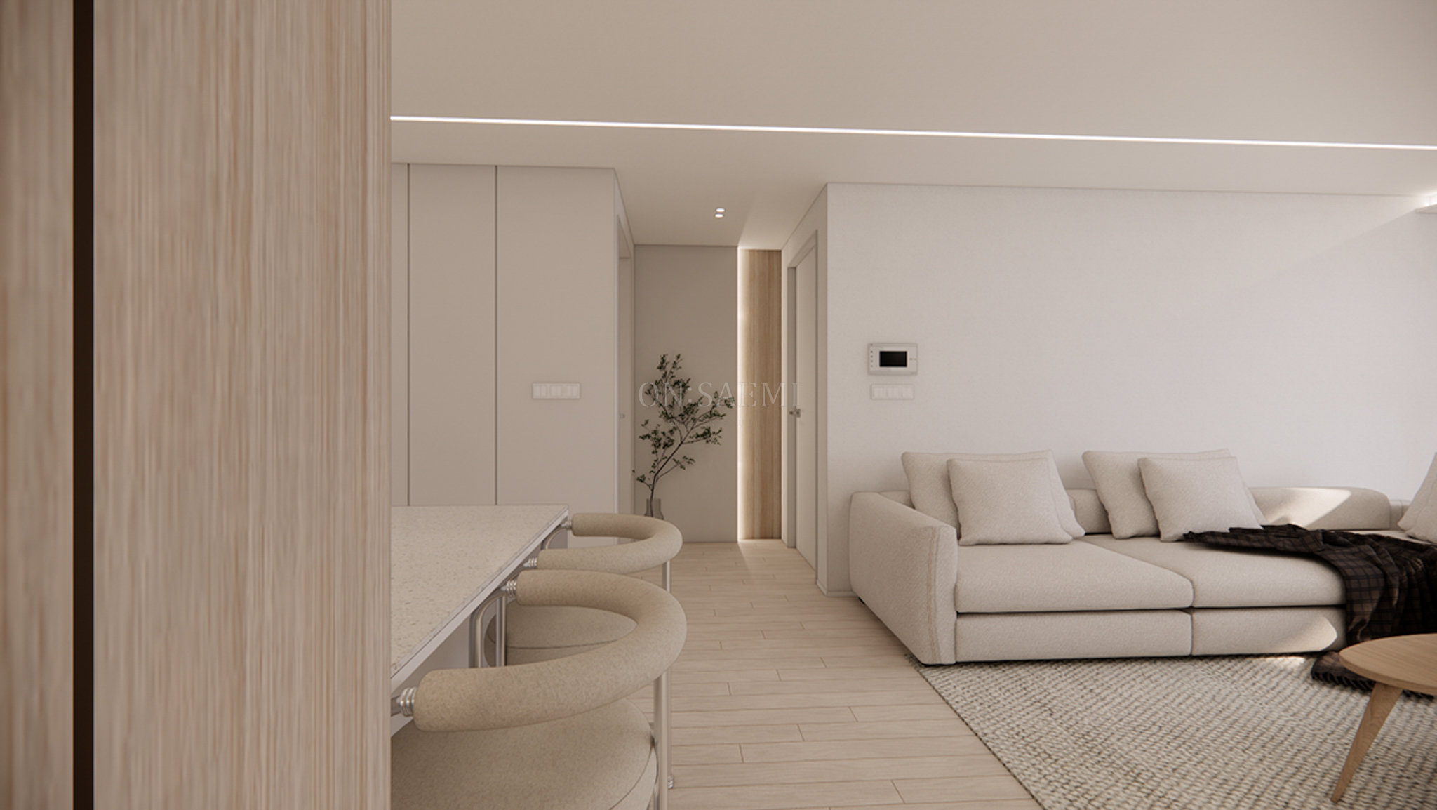 복도 _ 복도의 포인트 벽에는 우드와 간접 조명을 설치하여 디자인의 통일감을 더하고, 바닥에는 플랜테리어를 추가하여 분위기 있는 포인트 존을 만들었습니다. 거실과 주방은 매입 라인 등을 통해 자연스럽게 이어져 넓어 보이는 효과를 주며, 두 공간의 경계를 없애고 세련된 포인트를 추가할 수 있었습니다.