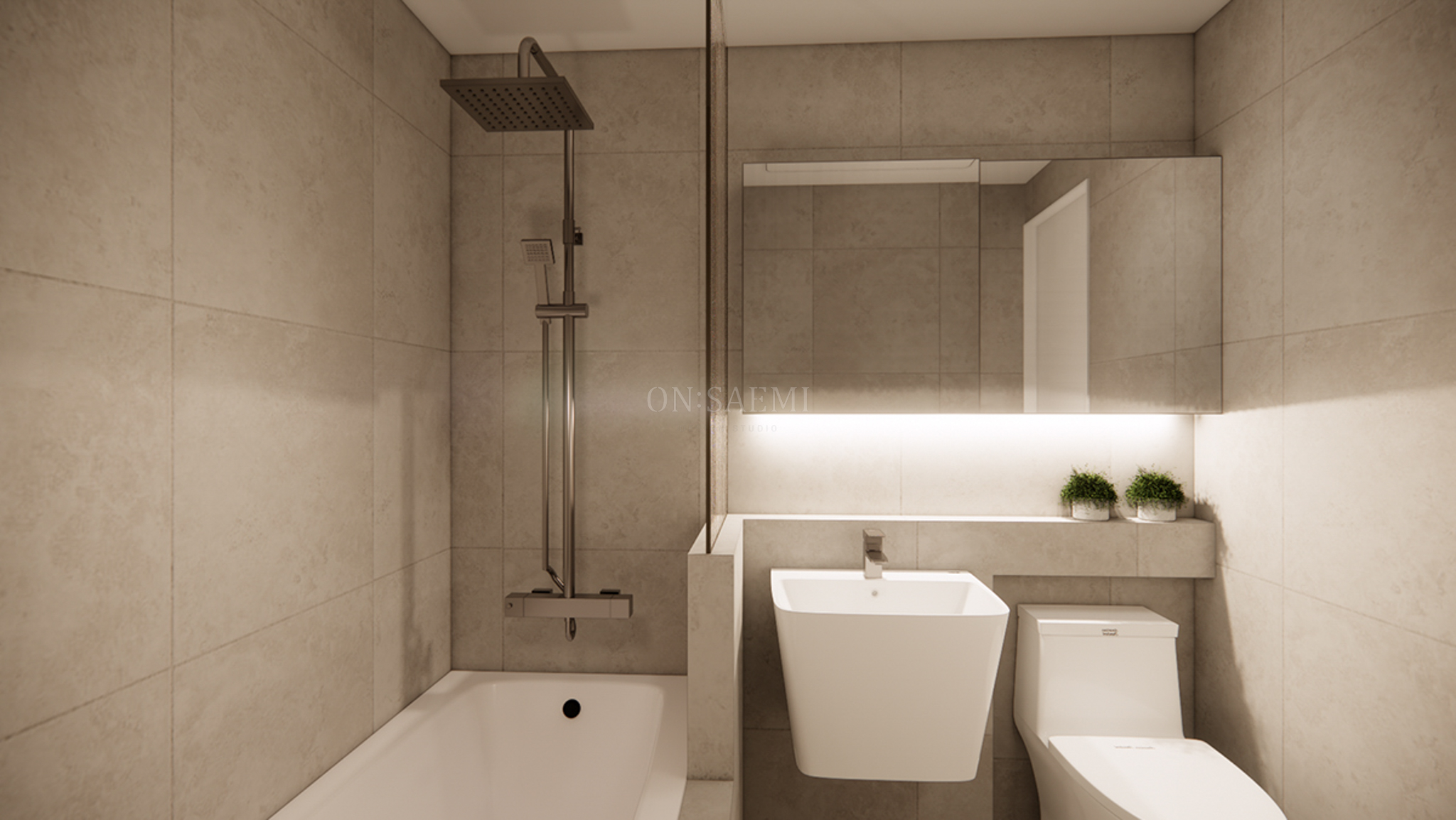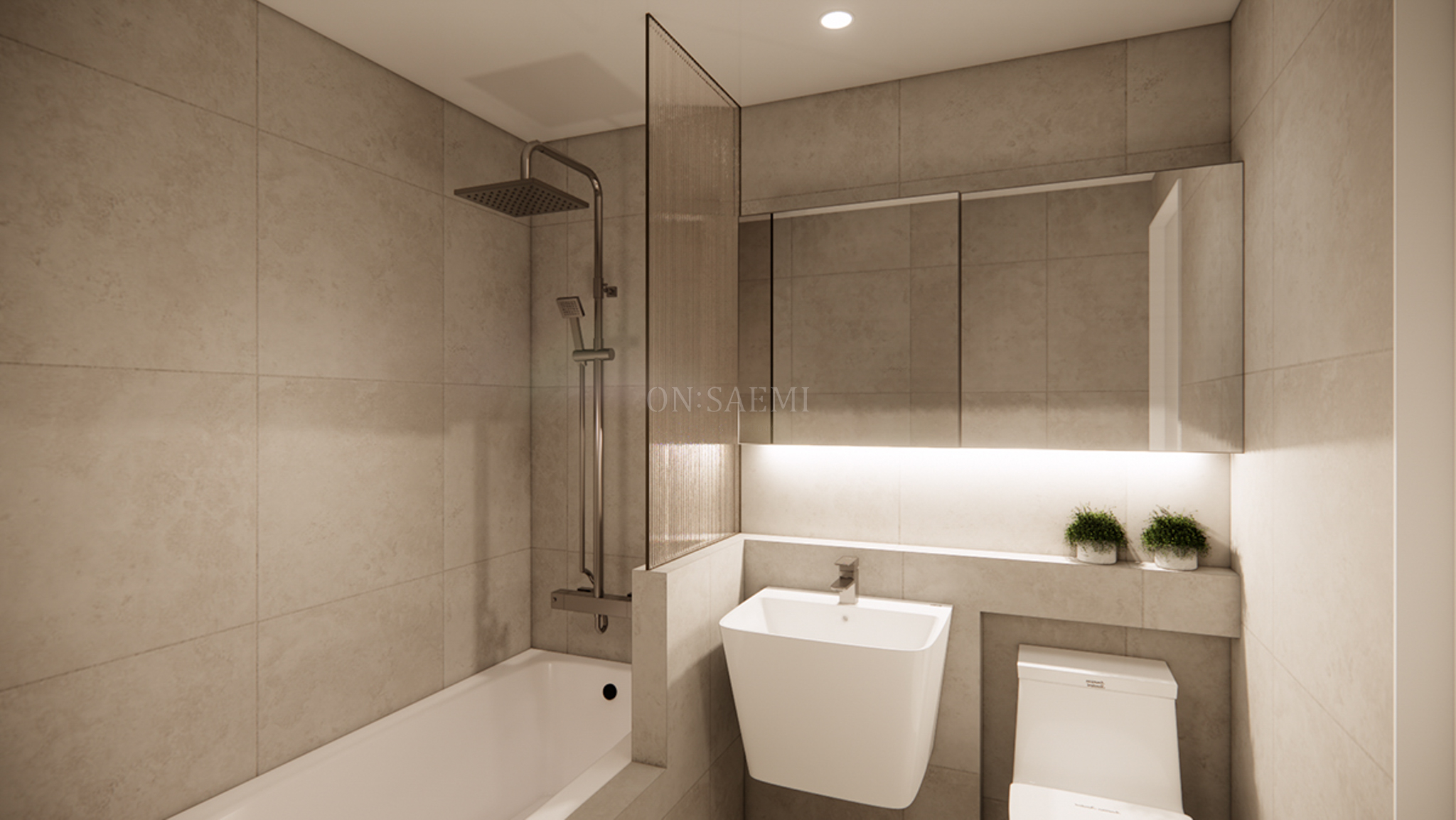 공용욕실 _ 바닥과 벽 타일은 600×600 각 웜 베이지 스톤 컬러를 선택하여 따뜻하고 밝은 느낌의 욕실을 완성했습니다. 여기에 반조적식 파티션 위에 모루 유리를 더해 작은 포인트를 추가하여 세련된 분위기를 더했습니다.