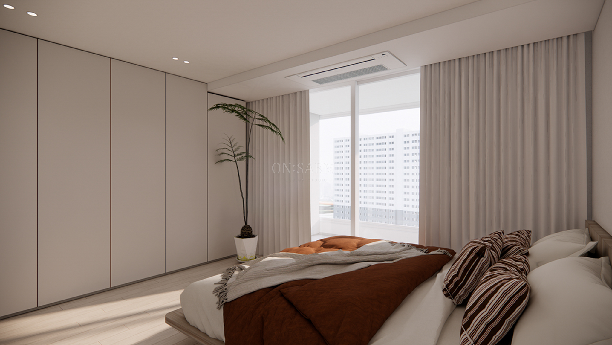 방1 _ 기존 발코니 부분의 붙박이장을 철거하고, 새로운 붙박이장을 제작하여 수납 공간을 확장했습니다. 또한, 기존에 매입된 붙박이장 부분에는 침대를 배치할 수 있도록 새로운 수납장을 제작하여 전체적으로 깔끔하고 효율적인 공간을 완성했습니다.