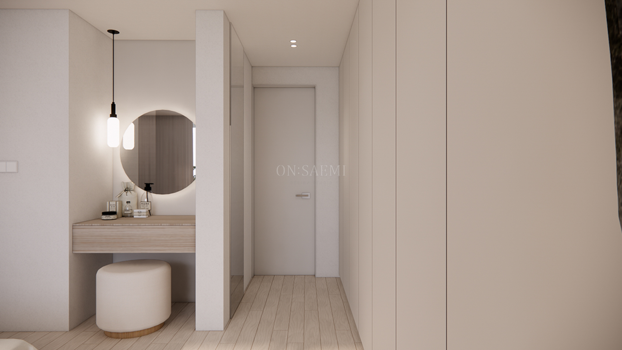 안방 _ 기존 매립 붙박이장을 철거하고 파우더 공간을 새로 만들어 좌식으로 사용할 수 있도록 화장대와 서랍장을 설치했습니다. 원형 거울과 포인트 펜던트를 시공하여 여성스럽고 우아한 분위기를 더했습니다. 또한, 붙박이장은 안방 욕실 입구까지 이어지도록 제작하여 공간을 더욱 깊고 넓어 보이게 만들어주었습니다.