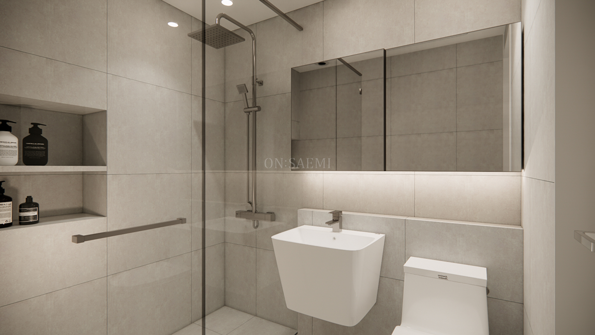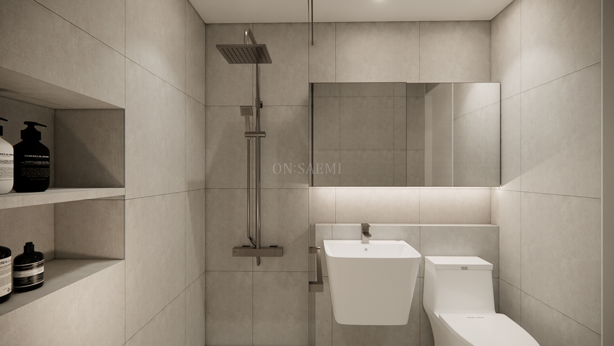 안방욕실 _ 바닥과 벽에 600×600 타일을 사용하여 일체감 있게 마감하였고, 타일 선반을 추가하여 따뜻한 느낌과 실용성을 더했습니다.