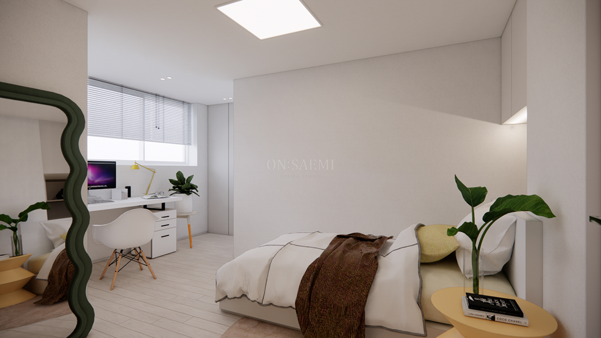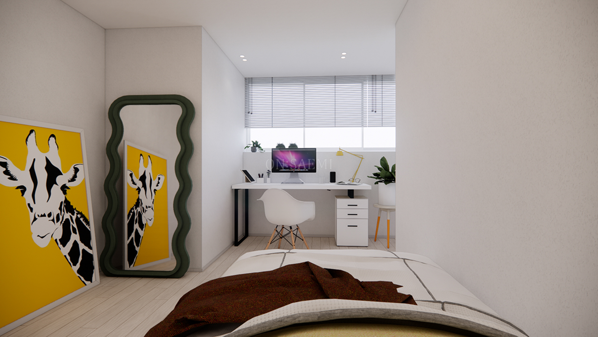 방2 _ 디아망 벽지로 깔끔하게 마감하고, 붙박이장은 화이트 계열로 제작하여 밝고 깨끗한 공간을 연출했습니다.