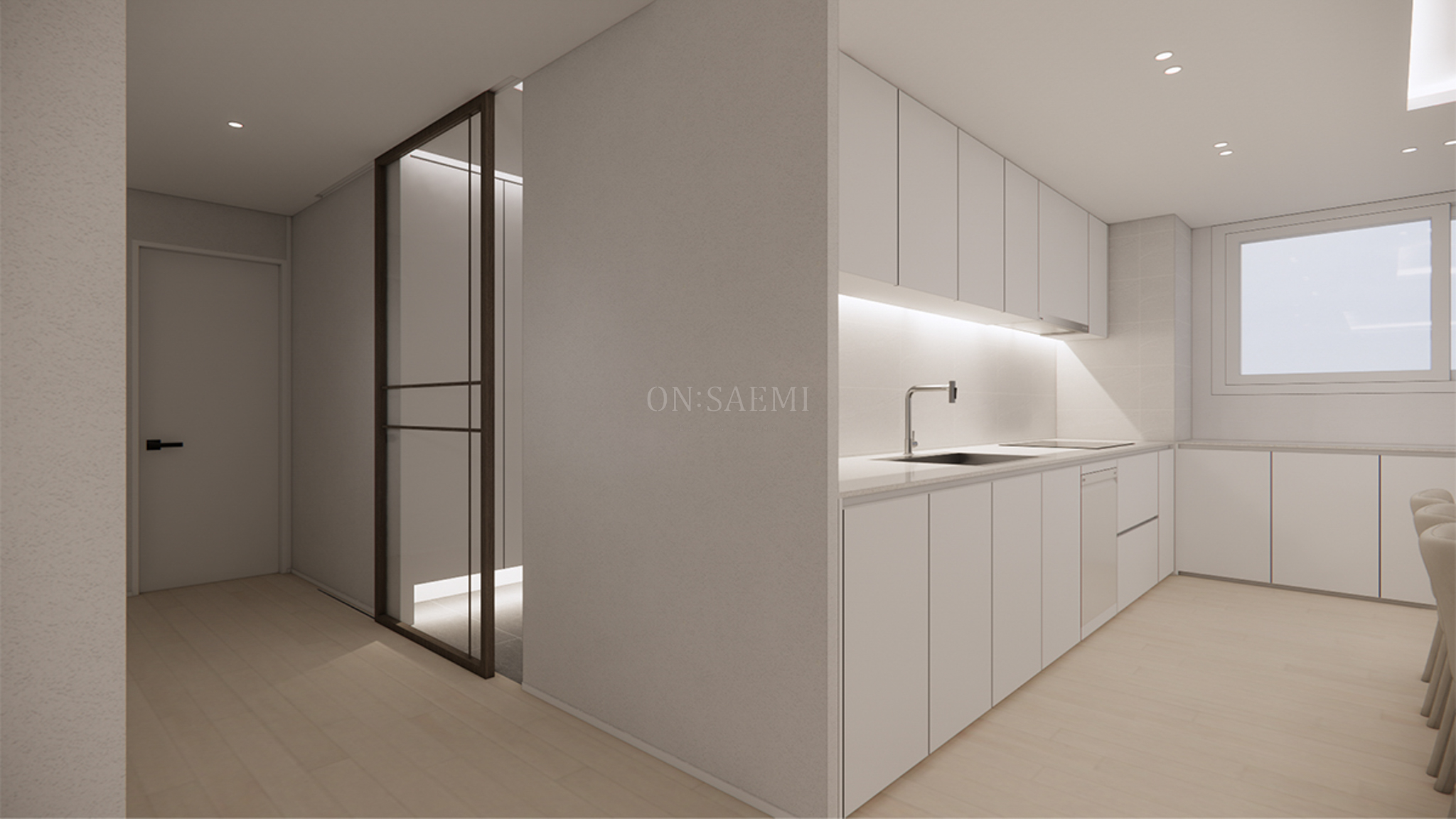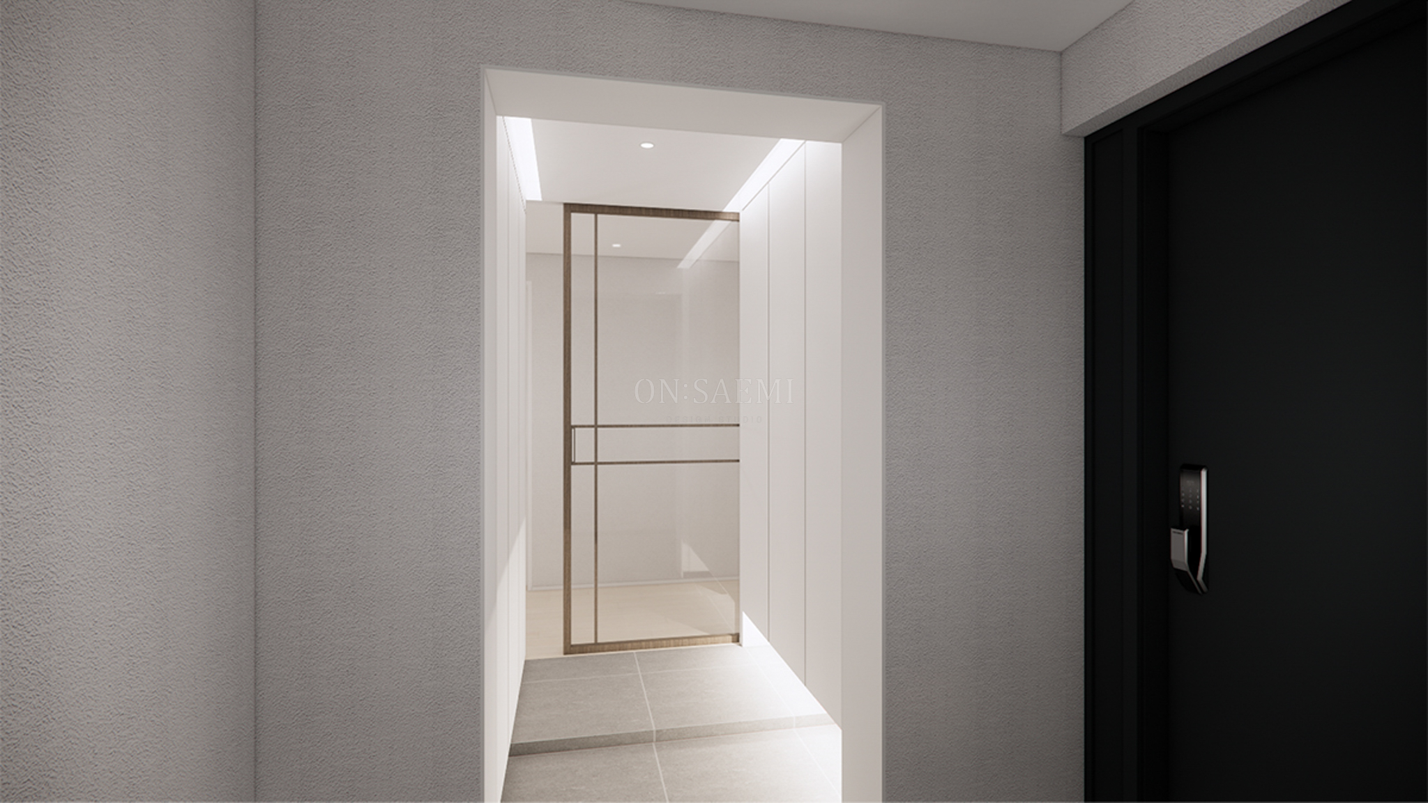 현관 _ 현관 바닥에는 600각 타일을 시공하여 넓어 보이는 효과를 주었습니다. 신발장은 넓게 설계하였으며, 하단부는 띄운 시공으로 간접등을 설치하여 세련된 분위기를 더했습니다. 또한, 현관 천장에는 간접등을 시공하여 밝고 환한 이미지를 연출하였습니다. 중문은 간살 디자인의 원슬라이딩 도어로, 아트월과 같은 무늬목 필름을 적용하여 전체적인 공간에 통일감을 주었습니다. 이 중문은 공간을 구분하면서도 개방감을 유지할 수 있도록 돕는 역할을 합니다.