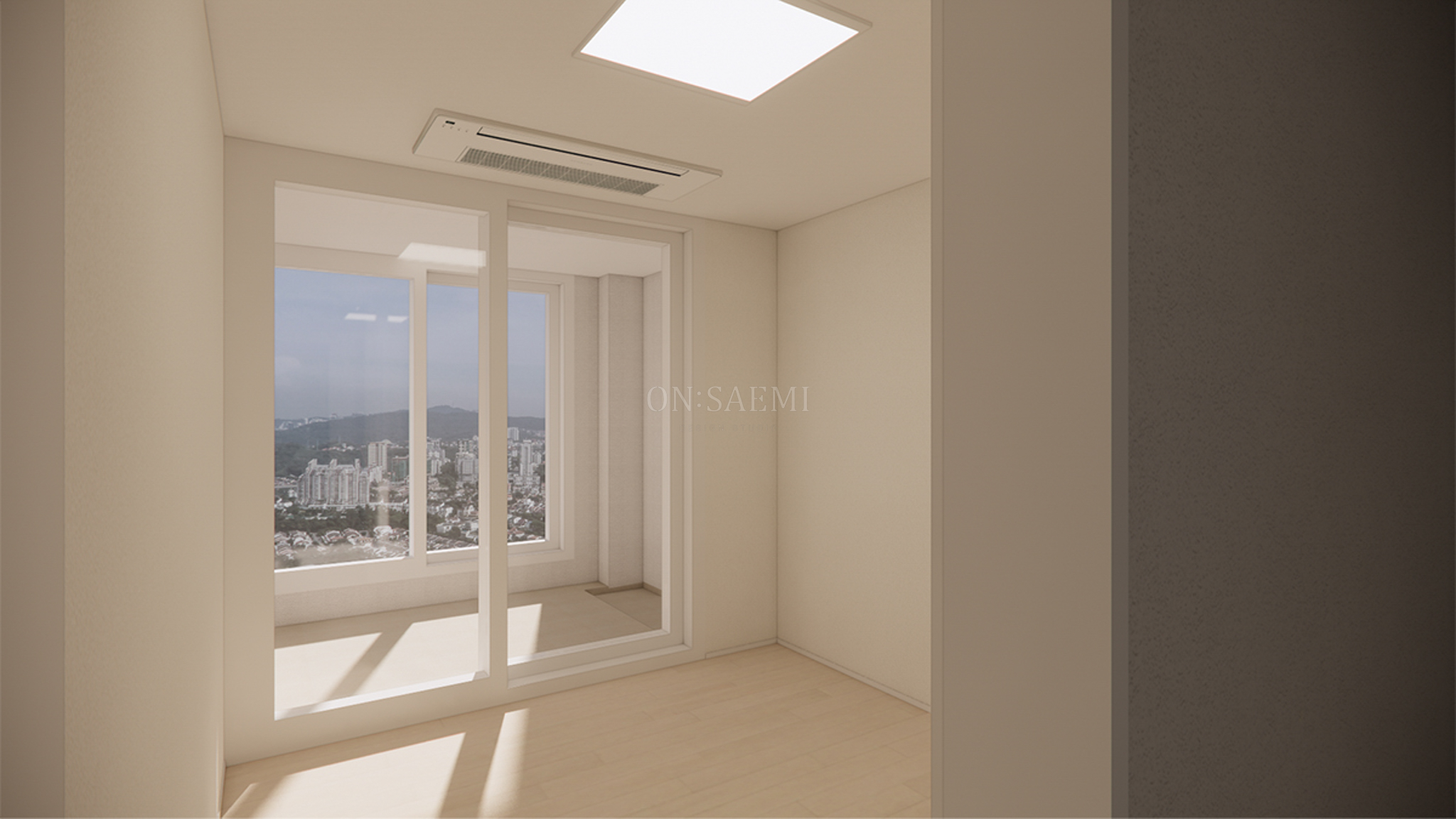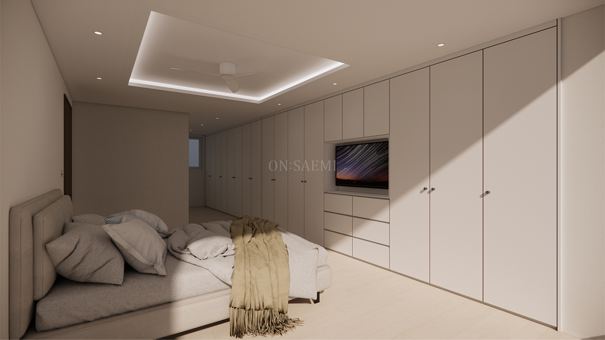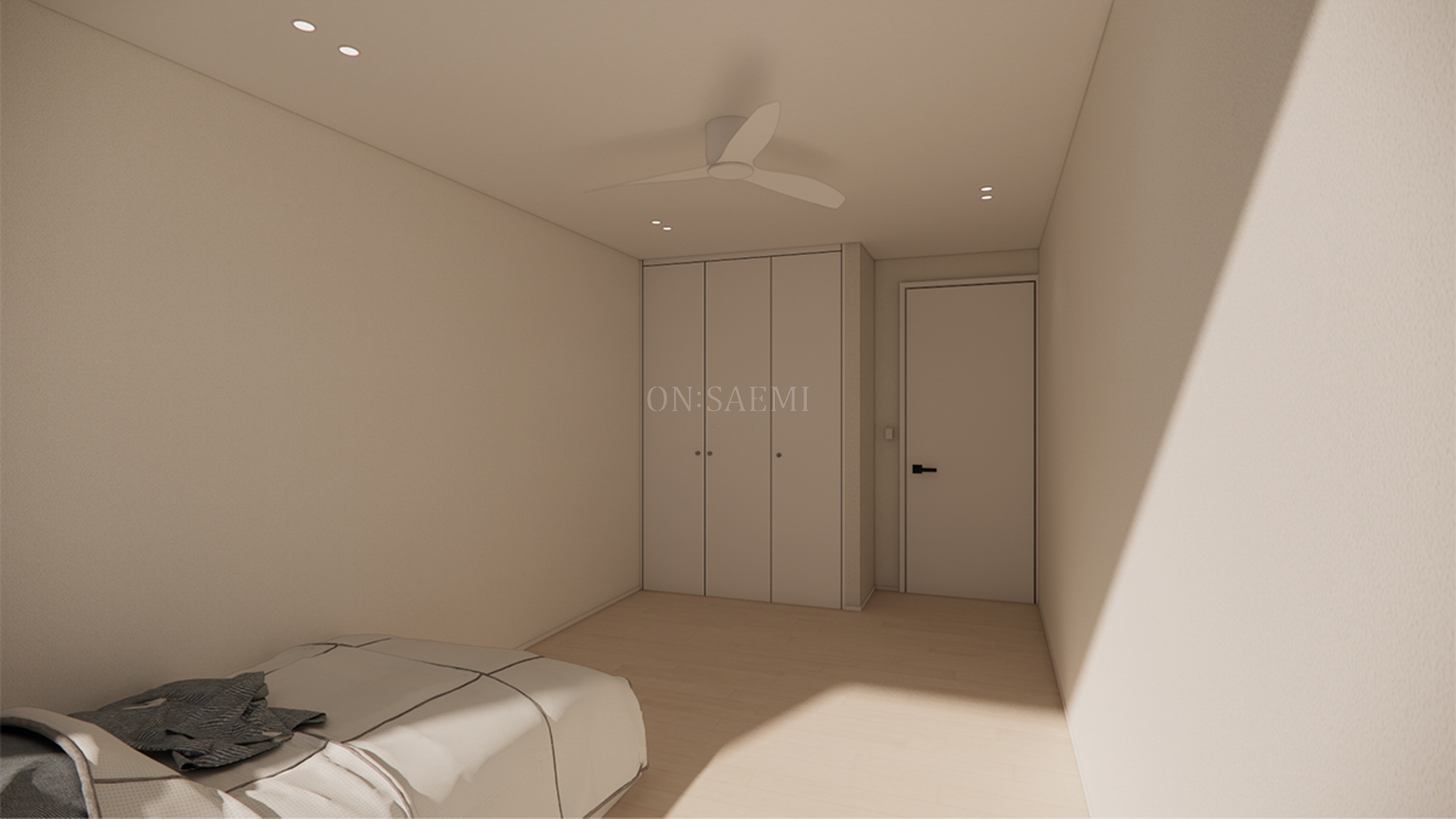 방1 _ 기존 붙박이장의 도어를 교체하고, 포인트 손잡이를 추가하여 세련된 느낌을 줍니다. 또한, 방 중앙에는 실링팬을 설치하여 시원하고 쾌적한 분위기를 제공합니다.