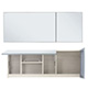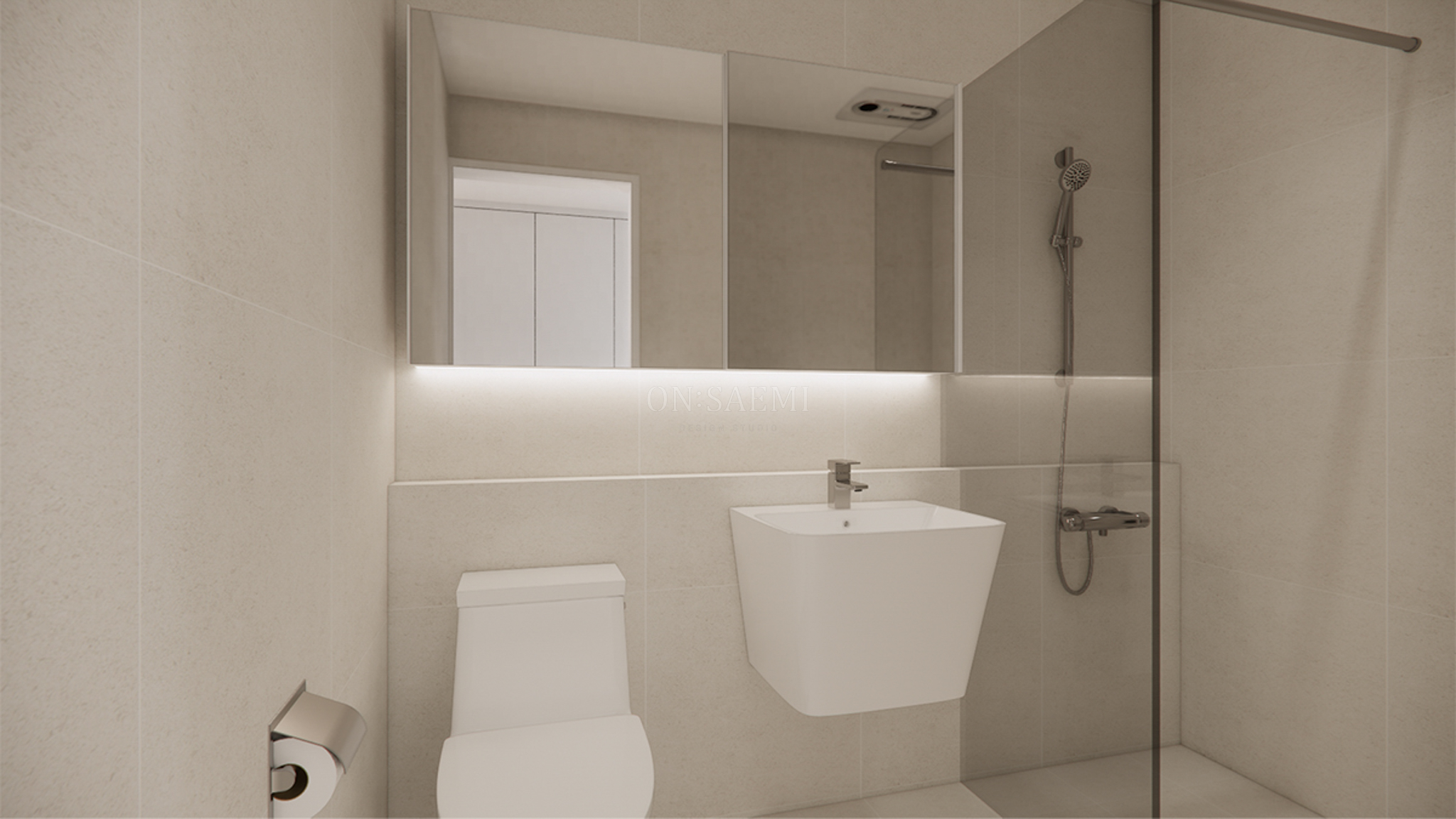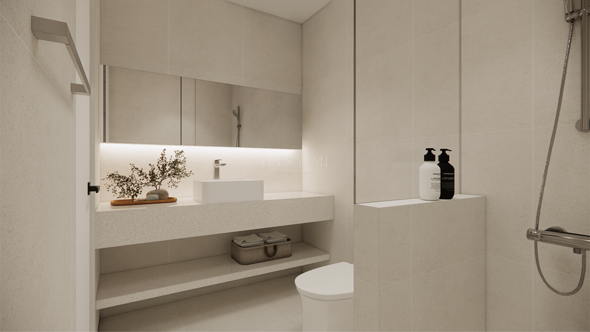 공용욕실 _ 아이보리 톤의 600각 타일을 벽과 바닥에 시공하여 고급스러운 느낌을 강조했습니다. 조적 파티션의 상단에는 유리를 설치하여 개방감을 살리고, 세면대와 샤워 공간을 효과적으로 분리했습니다. 조적 파티션에는 매립형 휴지걸이를 시공하여 더욱 깔끔한 인상을 주었습니다. 세면대는 대리석 상판을 시공하고, 탑볼을 설치하여 고급스러운 욕실을 완성했습니다. 욕실장은 맞춤 제작한 플랩장으로 벽면을 가득 채우며, 하단부에는 간접등을 시공해 따뜻한 분위기를 더했습니다.