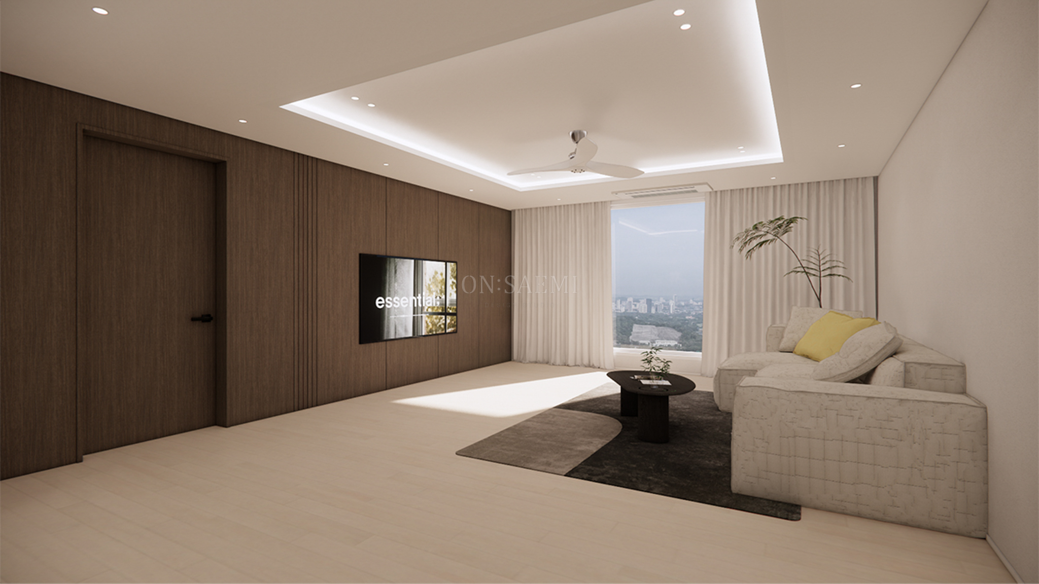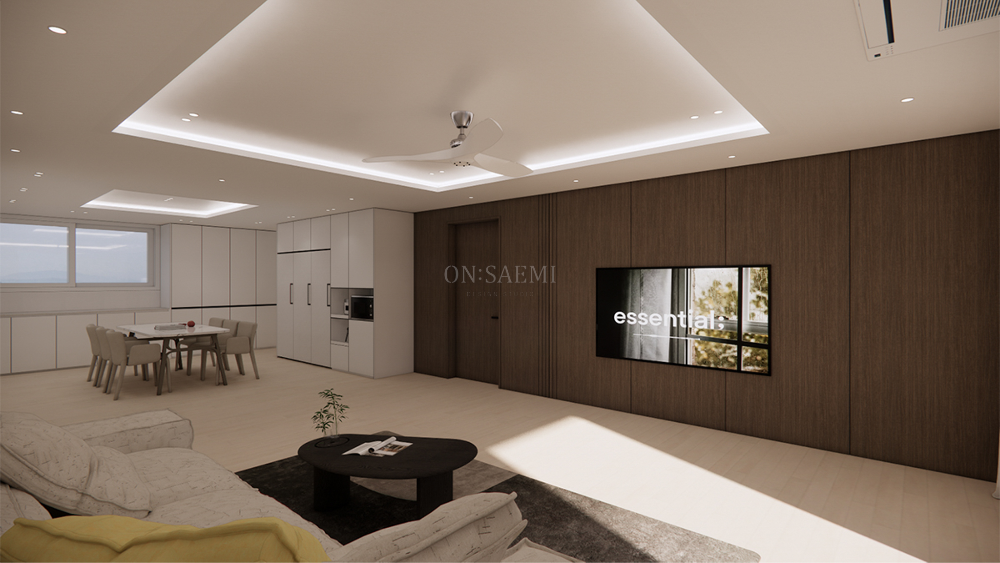 거실 _ 중앙에는 실링팬을 설치하고, 기존 우물천정을 살리면서 몰딩을 철거하여 무몰딩 우물천정으로 새롭게 시공했습니다. 여기에 간접등을 설치해 공간을 더욱 따뜻하고 넓어 보이게 연출했습니다. TV 아트월은 무늬목 필름을 적용하여 따뜻한 느낌을 더했으며, TV는 반매립 방식으로 깔끔하게 시공했습니다. 바닥은 밝은 화이트톤의 벽지와 무늬목 필름이 잘 어울리는 따뜻한 느낌의 마루를 선택하여, 전체적으로 조화로운 분위기를 완성했습니다.