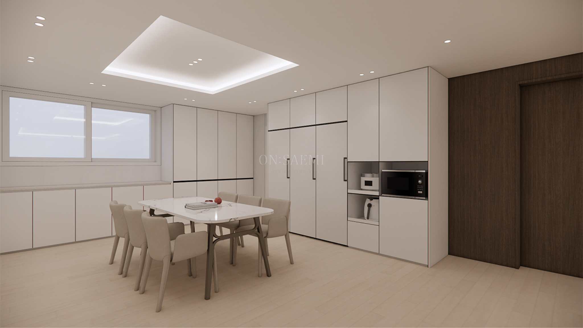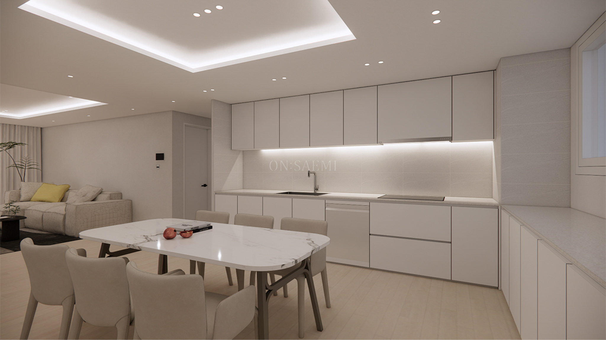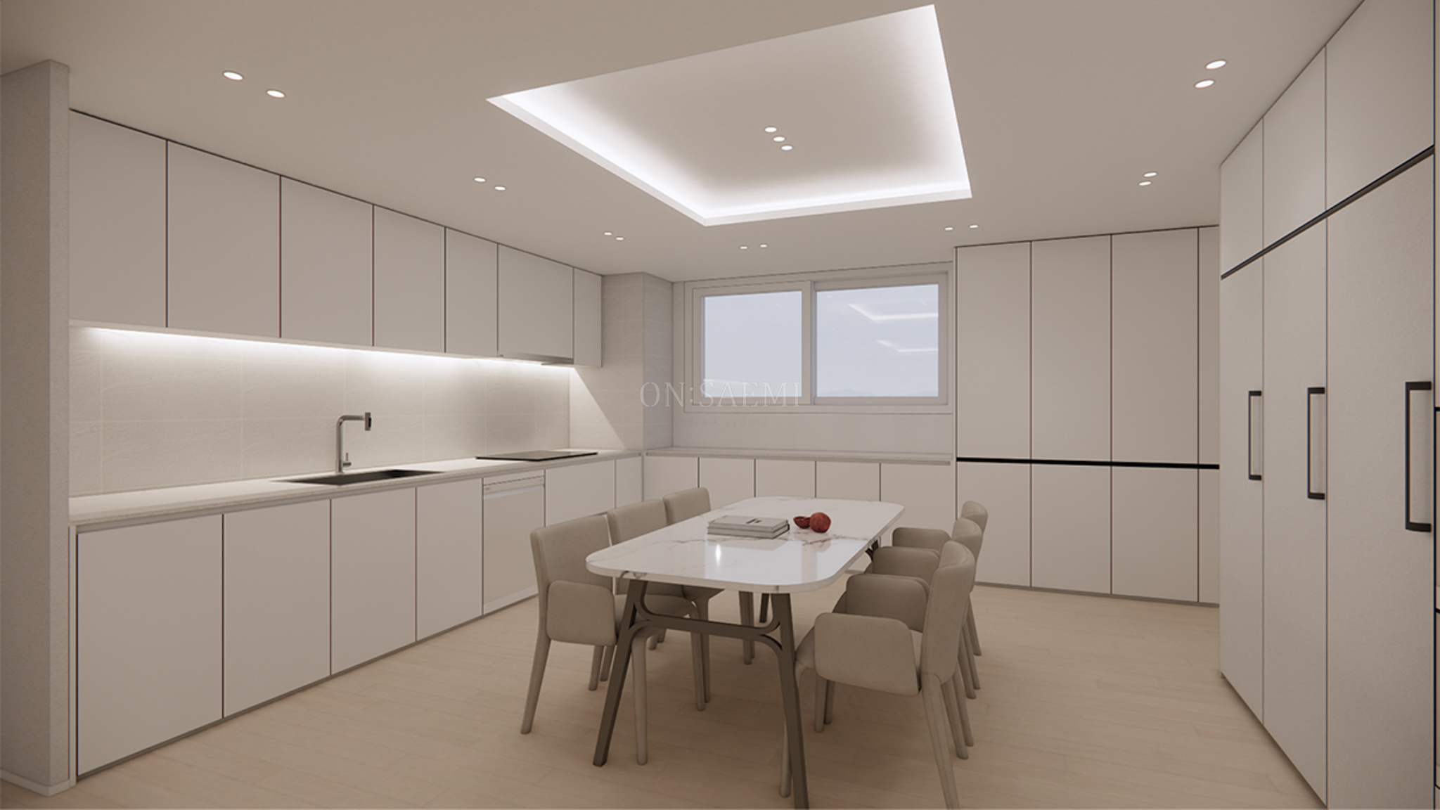 주방 _ 올 화이트 주방으로 깔끔하고 세련된 분위기를 연출했습니다. 기존의 아일랜드를 철거하고 중앙에 6인 테이블을 배치하여 주방을 더욱 넓고 실용적으로 활용할 수 있게 했습니다. 식탁등 대신 우물천정에 간접등을 설치하여 공간의 깔끔함을 더욱 강조했습니다.