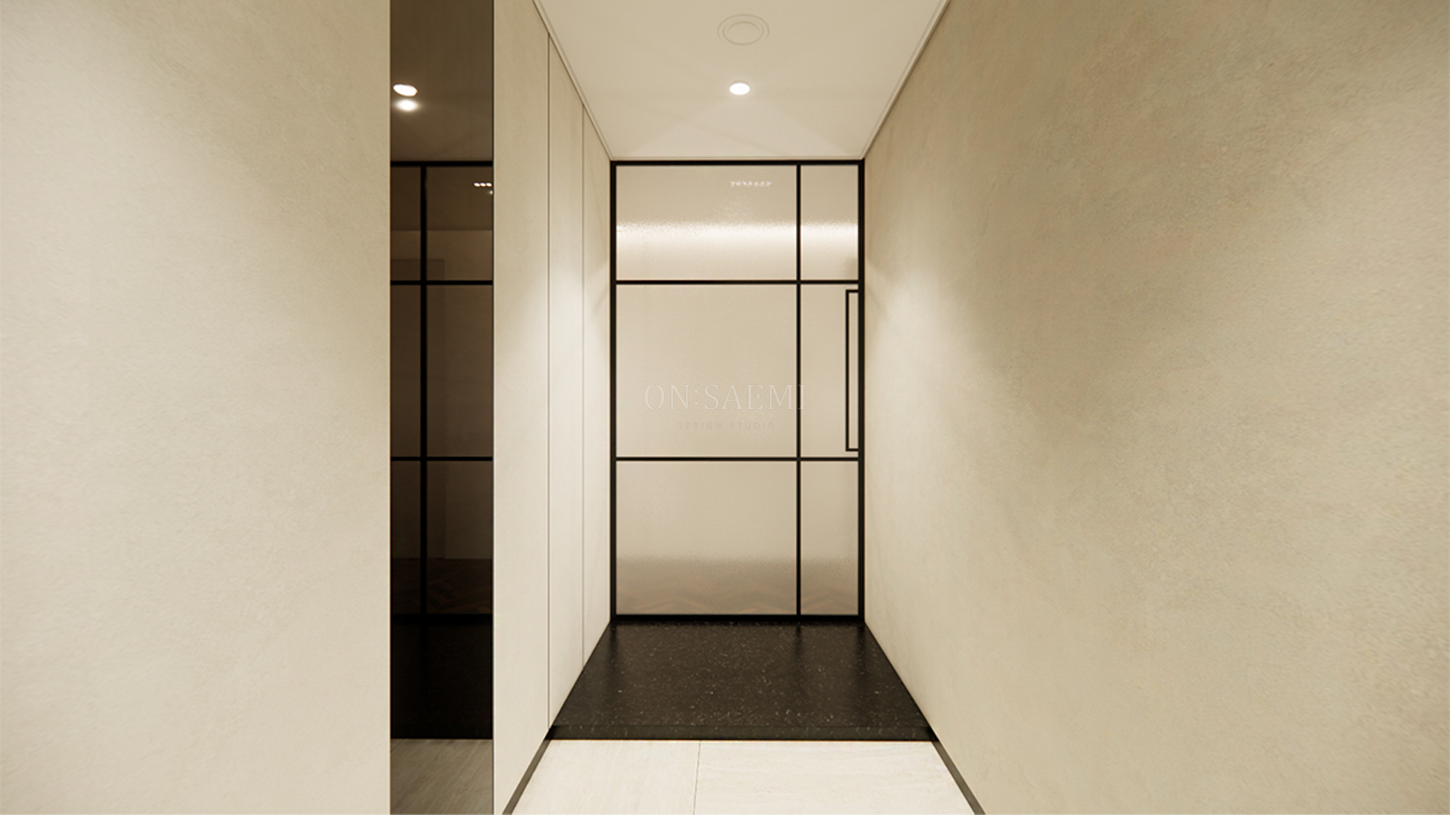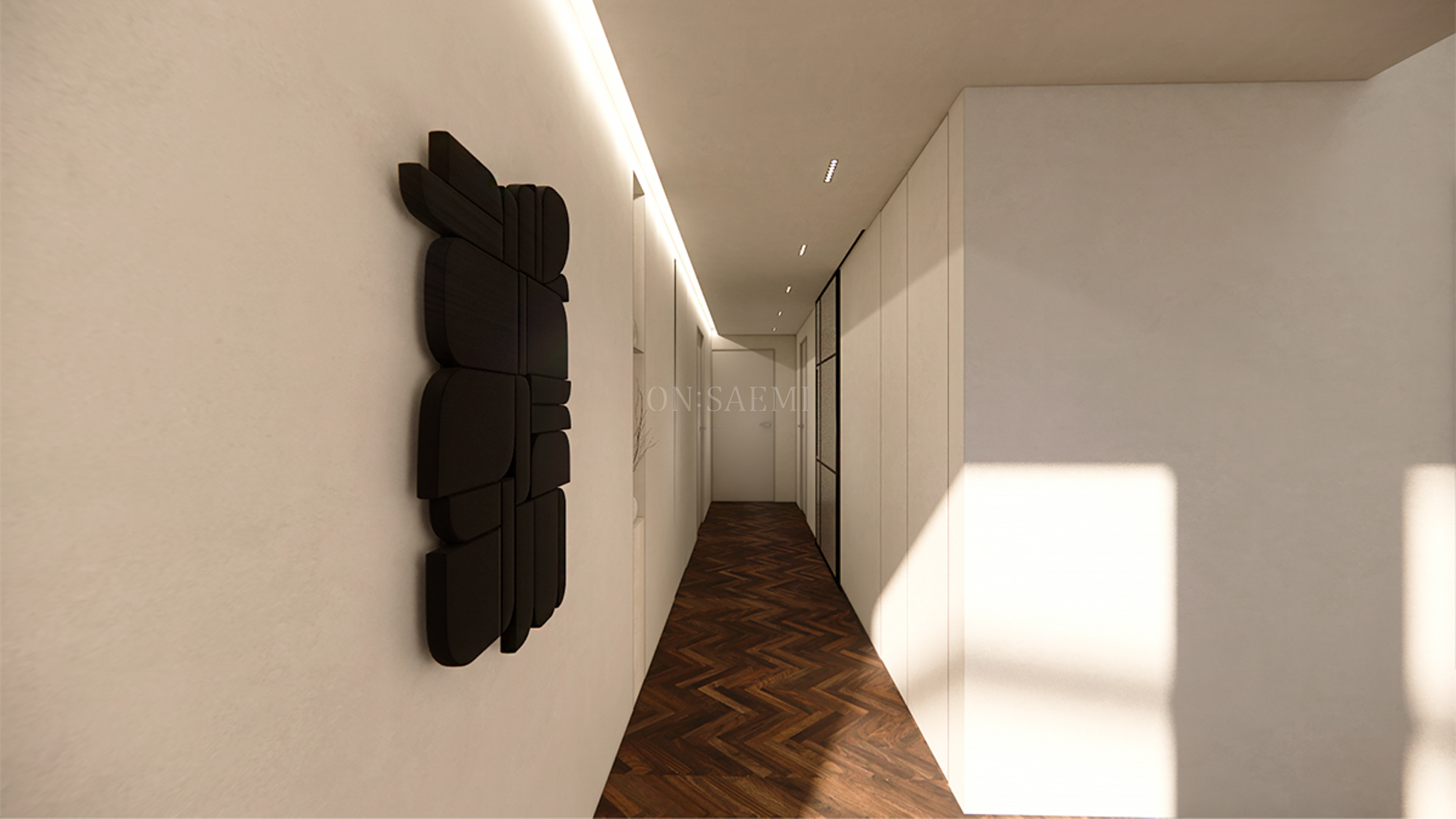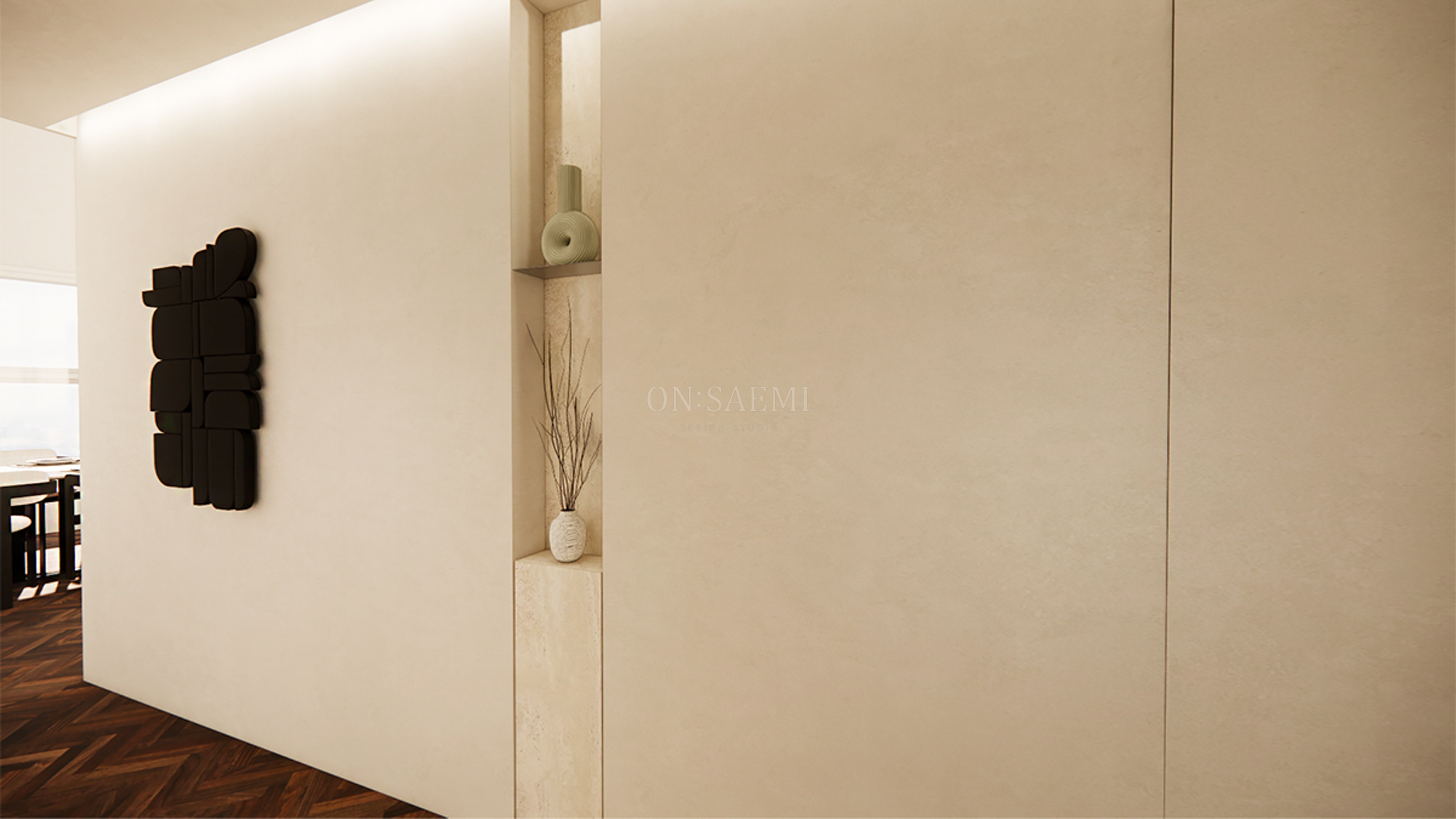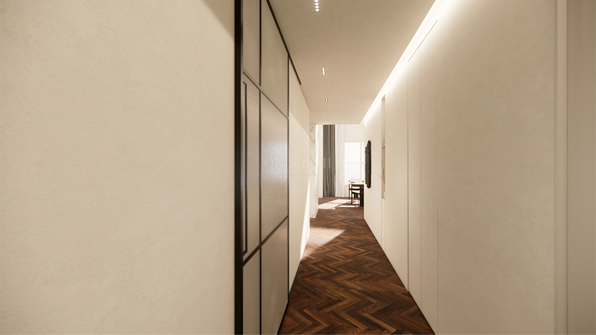 현관&복도 _ 입구에서 바로 들어올 때, 깔끔한 도장 마감으로 마무리된 공간을 제공하며, 갤러리처럼 그림을 걸어 연출할 수 있도록 설계되었습니다. 또한 천장 부분에는 간접 조명을 활용하여 은은한 분위기를 조성하고, 마그네틱 사각 매입등을 설치하여 조명의 효과를 극대화했습니다.