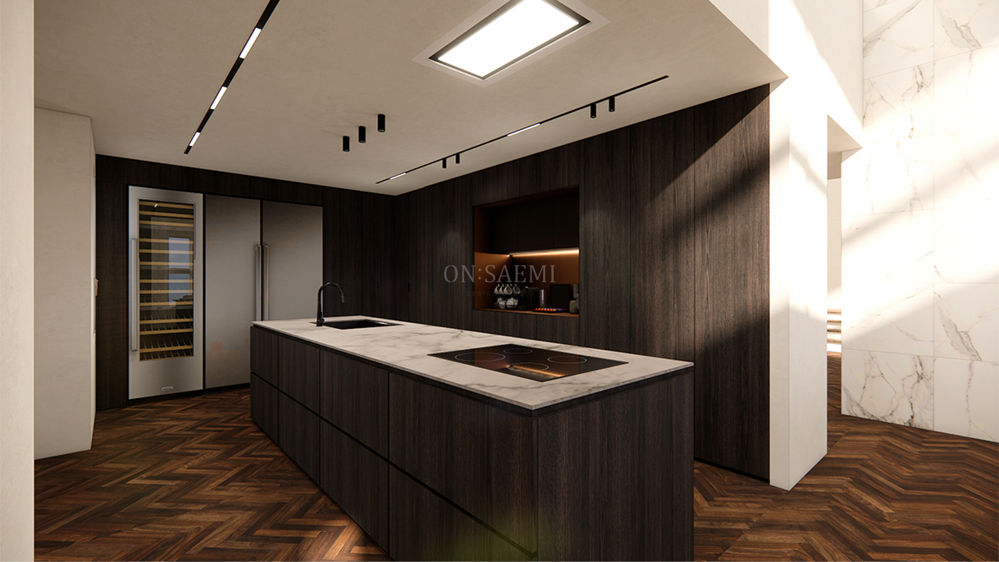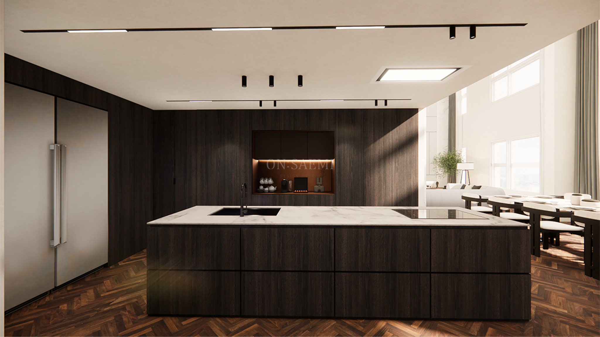 주방 _ 기존 구조에서 주방 옆 방을 철거하여 주방을 확장하고, 딥 우드와 아이보리 도장의 투톤 매치를 통해 고급스러운 무게감을 느낄 수 있는 공간으로 업그레이드했습니다. 대면형 아일랜드를 넓게 시공하고, 상판은 톤 앤 매너를 맞춰 세련되게 마감했습니다. 후면의 키큰장 가운데 부분에는 홈바를 추가하고, 세련된 컬러와 간접등을 사용해 포인트를 주었습니다. 또한, 키큰장 일부에 복도와 연결되는 가구 도어를 맞추어 공간을 효율적으로 활용했습니다.