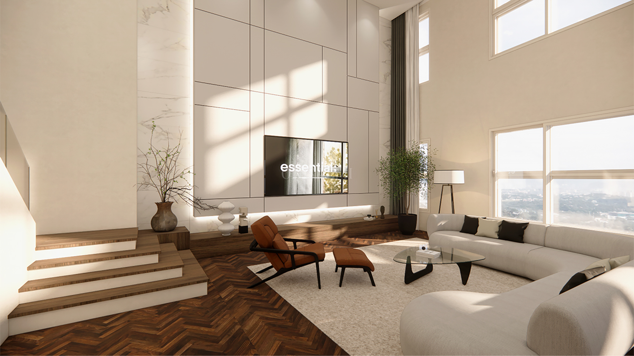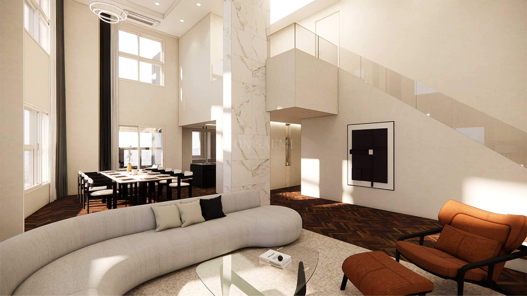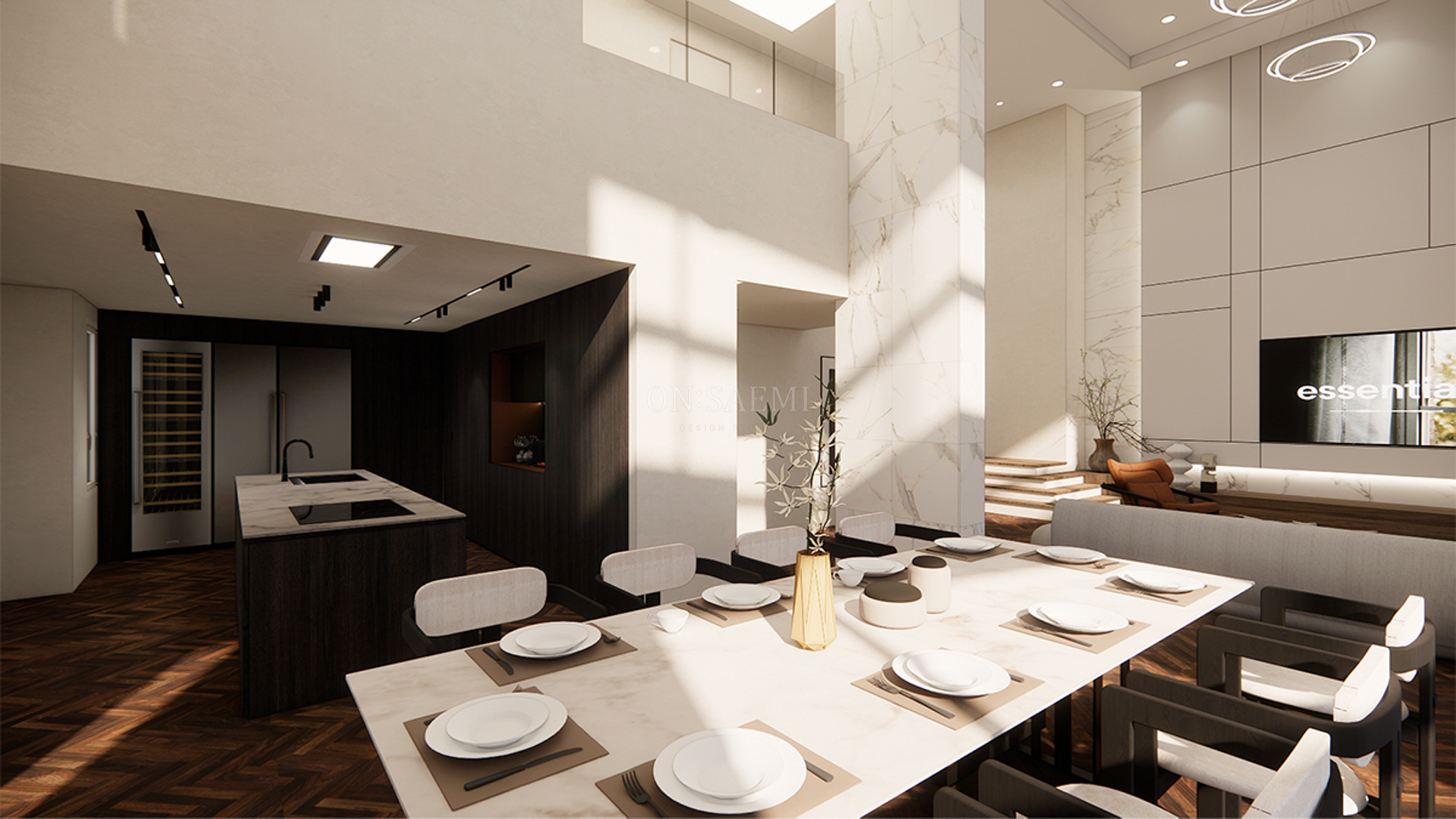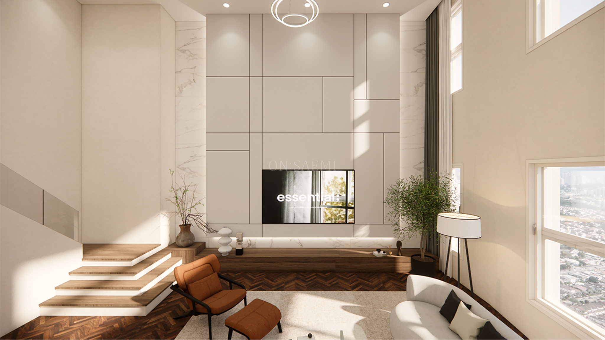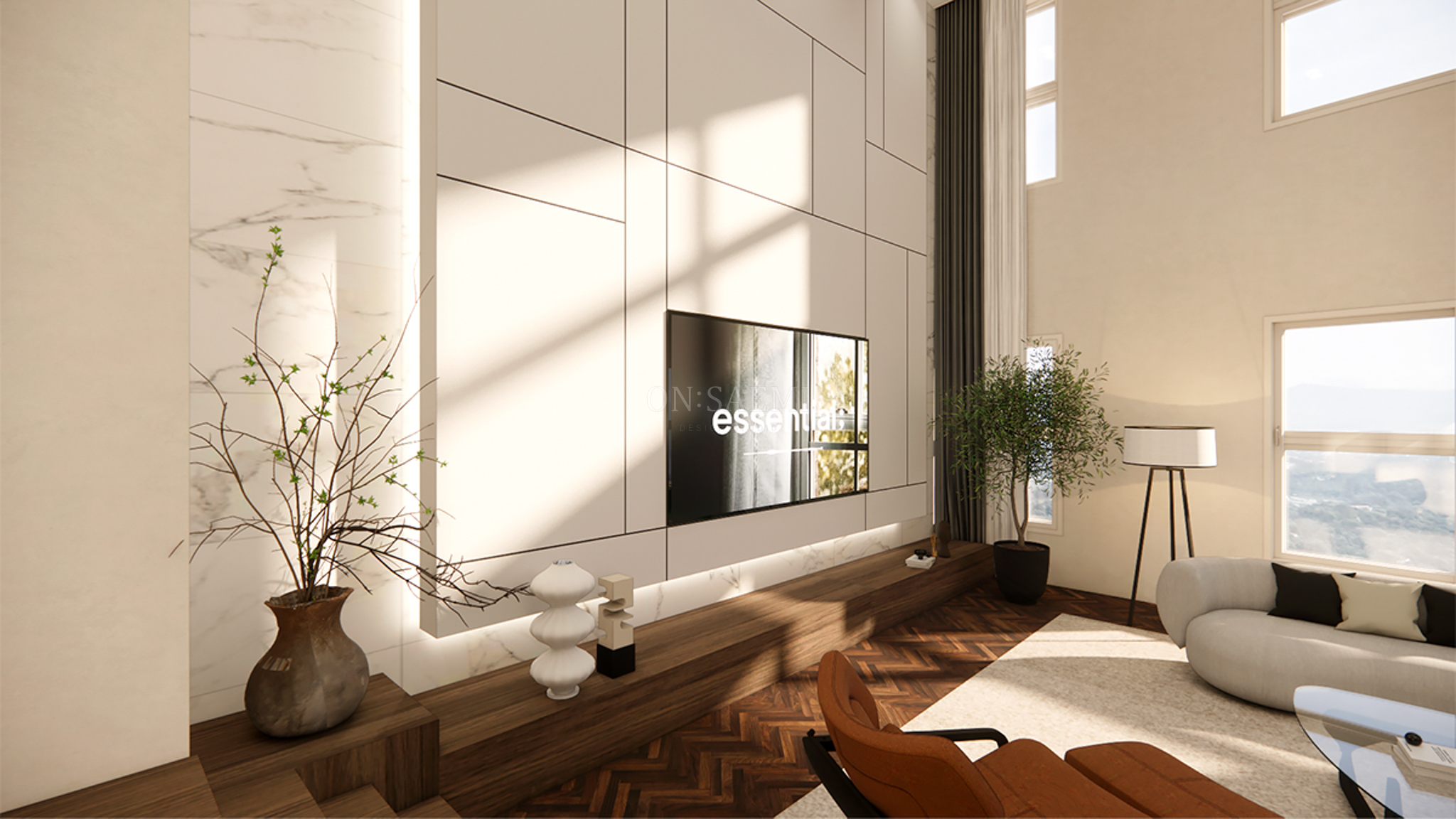 거실 _ 전체 복도와 거실은 석고보드 마감 후 도장 작업을 통해 깔끔하고 심플하면서도 갤러리 같은 분위기를 연출했습니다. 아트월 포인트 부분은 천장까지 이어지는 목공 작업으로 메지라인을 변형하여 간접 조명을 추가, 고급스럽고 현대적인 디자인을 강조했습니다. 아트월 뒷부분에는 대리석 타일을 배치하고, 하부 TV 선반은 우드 필름으로 마감하여 서로 다른 분위기의 공간을 조화롭게 구성했습니다.