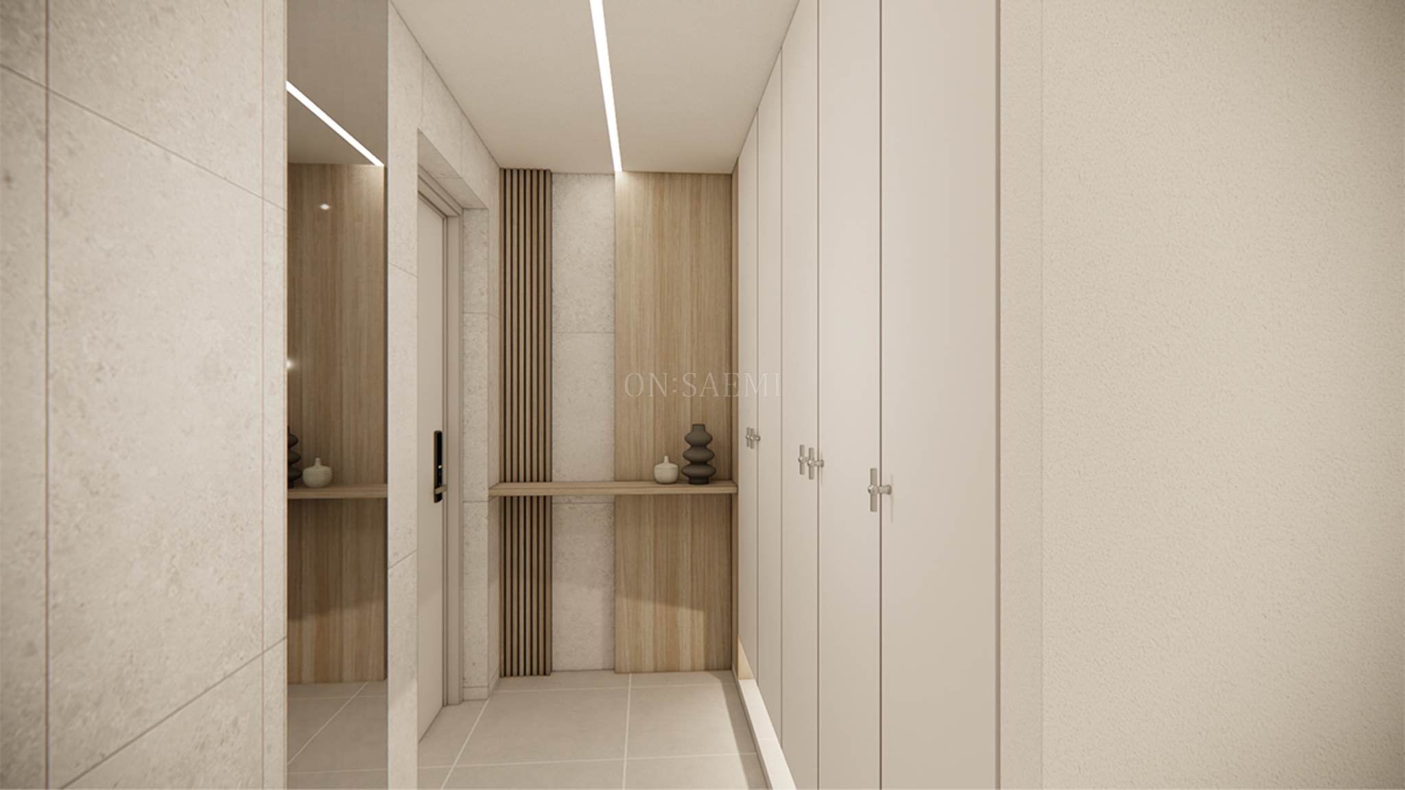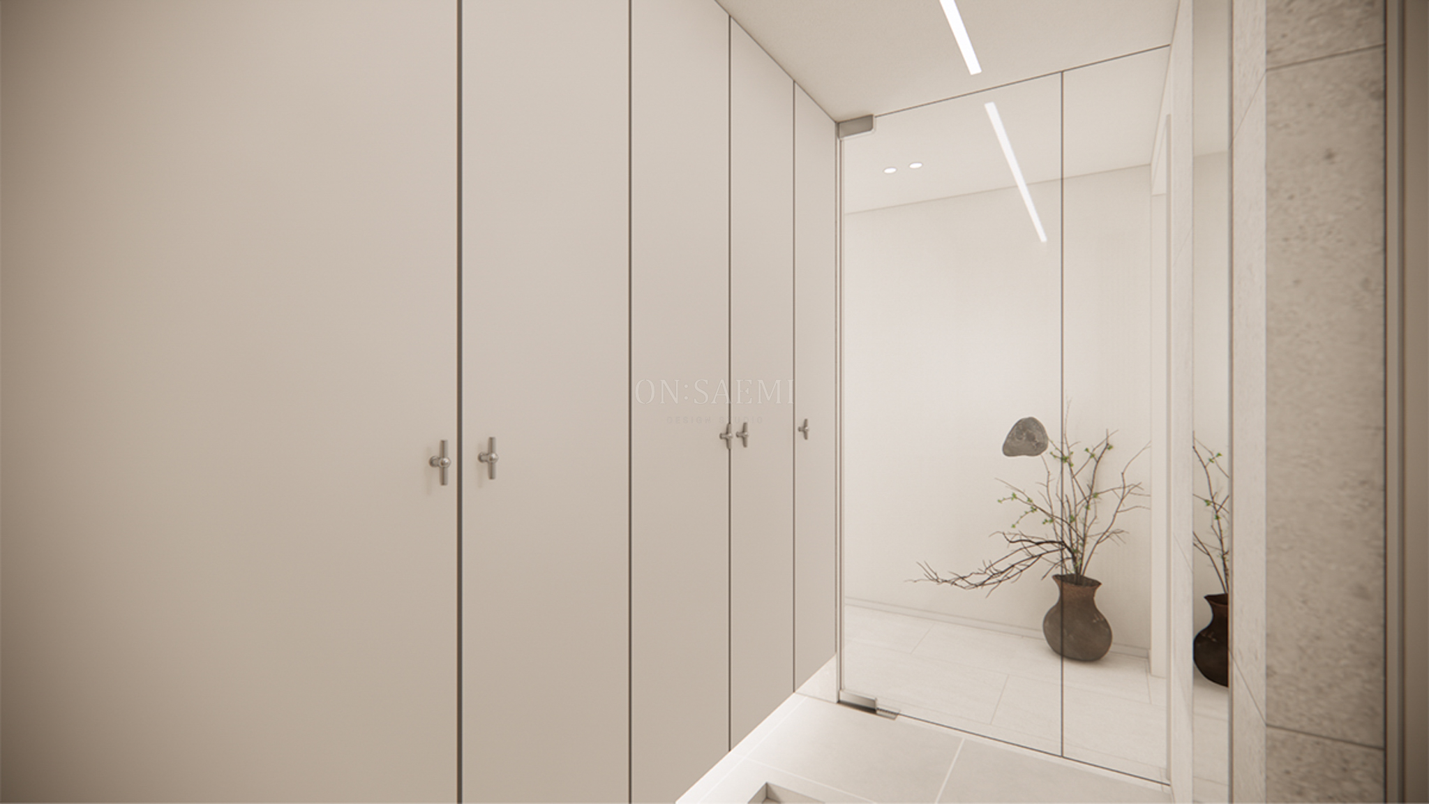 현관 _ 현관에 들어서면 화이트 신발장과 벽면의 우드 간살, 타일로 디자인된 포인트 월이 세련되게 반겨줍니다. 포인트 월에는 선반을 설치하여 오브제를 놓을 수 있게 해 절제된 미를 강조하며, 신발장 손잡이와 거울을 세심하게 마감하여 작은 디테일로 포인트를 더했습니다. 노프레임 통유리 중문과 디자인된 스톤 손잡이를 제작해 공간에 답답함 없이 시원하고 열린 느낌을 제공합니다.