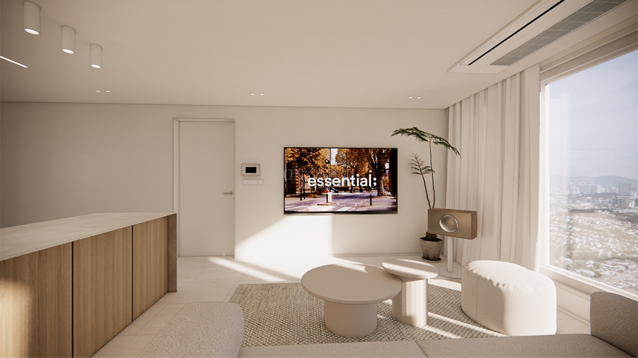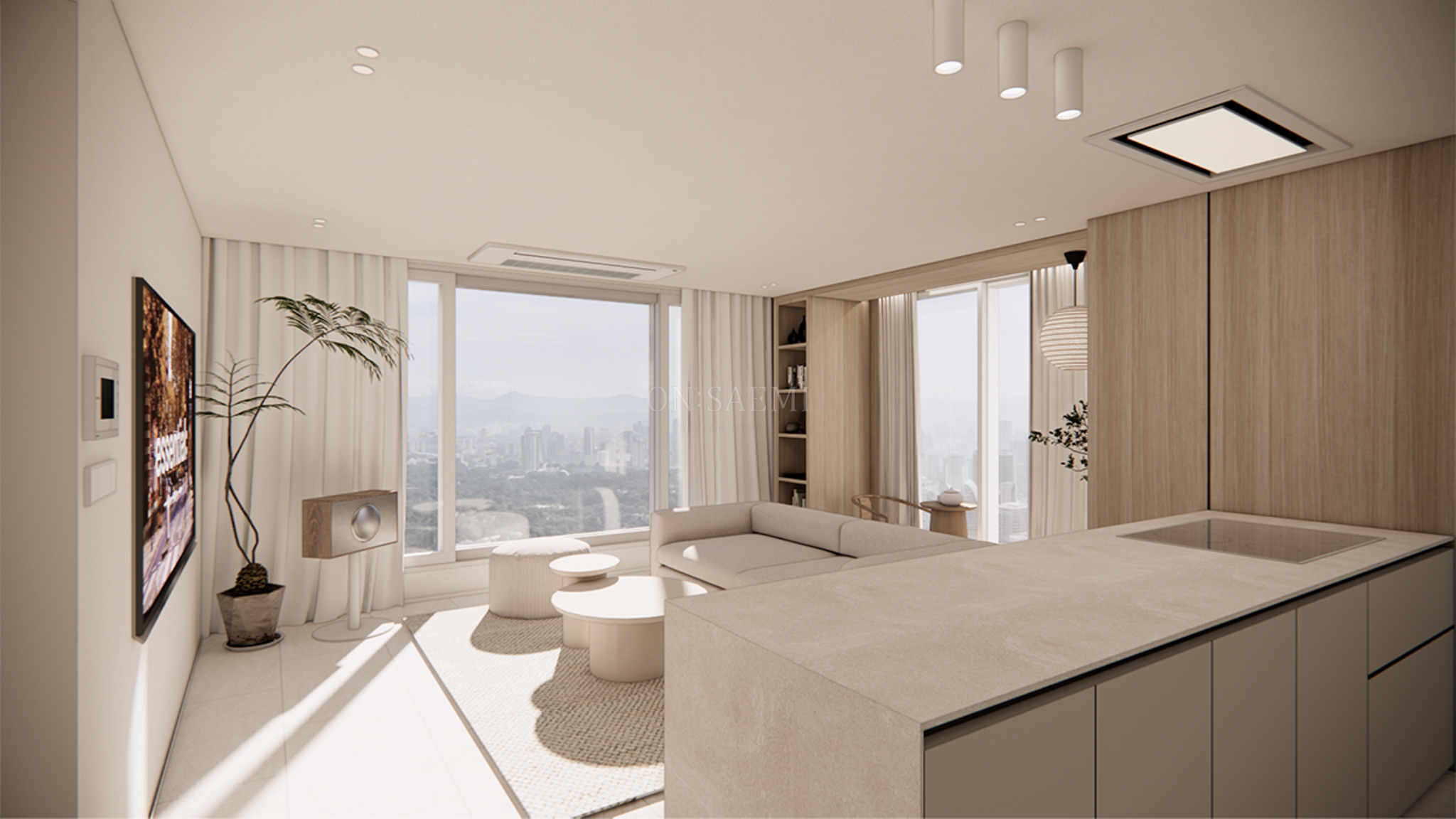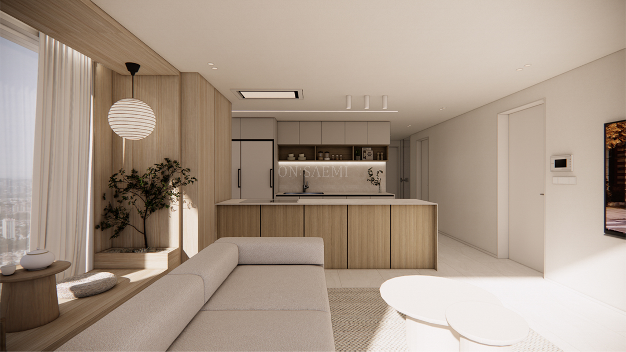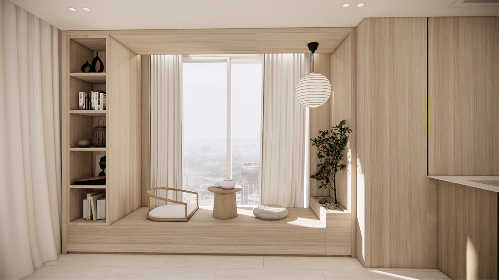 거실 _ 기존 발코니 벽과 다도 공간을 우드 필름으로 자연스럽게 연결하고, 창가 부분에는 젠 스타일의 디자인을 접목하여 다도를 즐길 수 있는 평상을 제작했습니다. 평상 옆에는 작은 조경을 배치하고, 펜던트 조명을 추가하여 자연적이고 평온한 분위기를 연출했습니다. 또한 평상 부분에는 선반을 설치해 도자기 오브제나 책 등을 디스플레이할 수 있는 공간을 마련하여, 공간의 미적 가치와 실용성을 동시에 높였습니다.