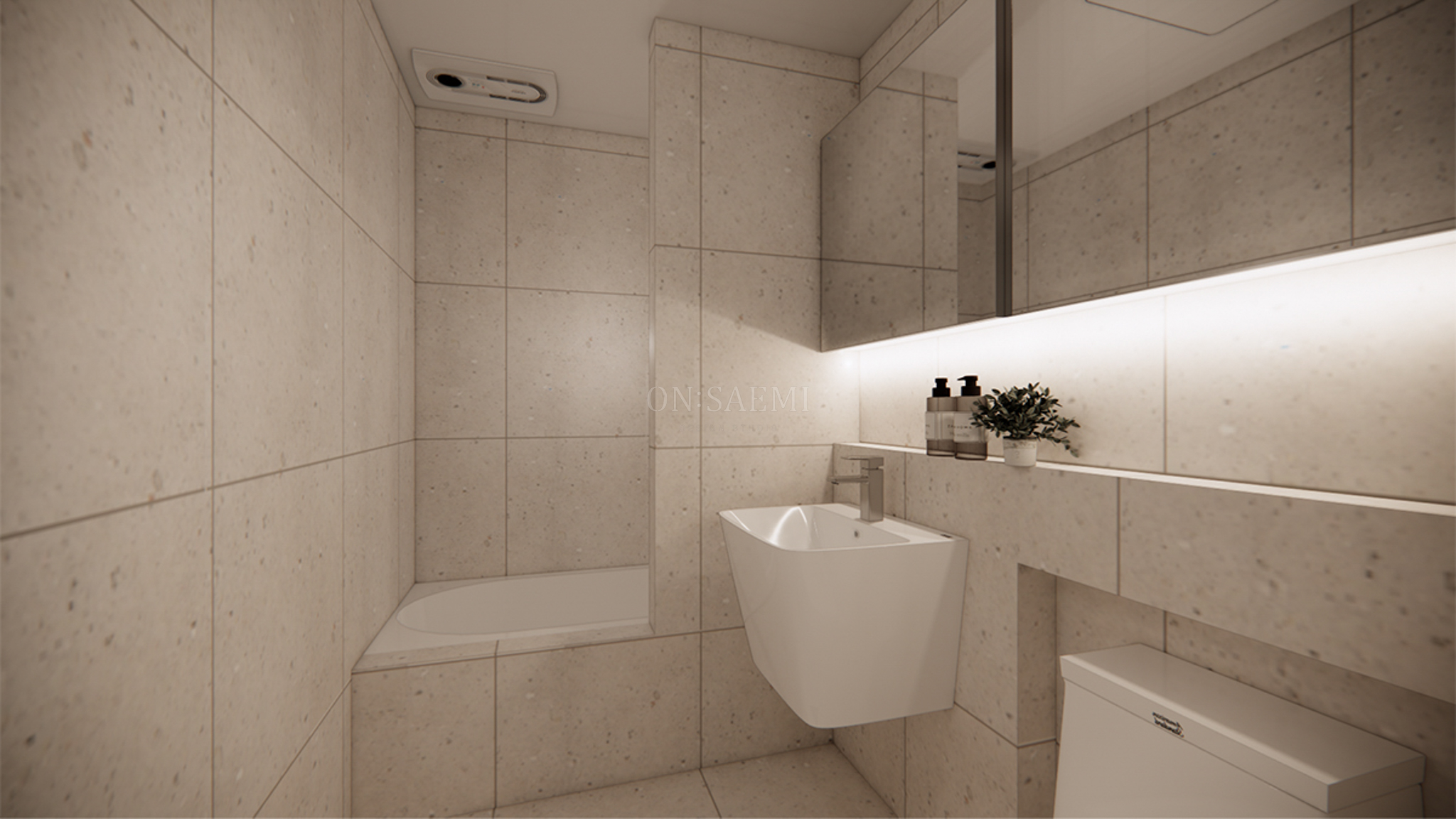 공용욕실 _ 바닥과 벽 타일은 600x600mm 크기의 웜베이지 컬러에 작은 테라조 무늬를 선택하여 따뜻하고 밝은 느낌의 욕실을 연출했습니다. 이 디자인은 공간에 아늑하고 포근한 분위기를 더하며, 세련된 느낌을 줍니다. 욕조 공간에는 조적식 파티션을 설치해 샤워를 즐길 수 있는 개인적인 공간을 만들었고, 아늑하고 편안한 환경을 제공합니다.