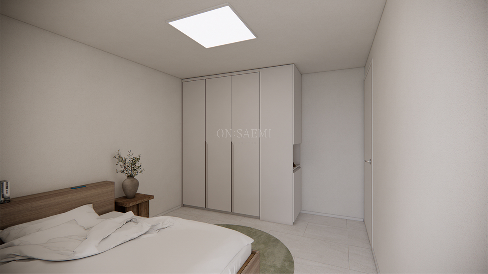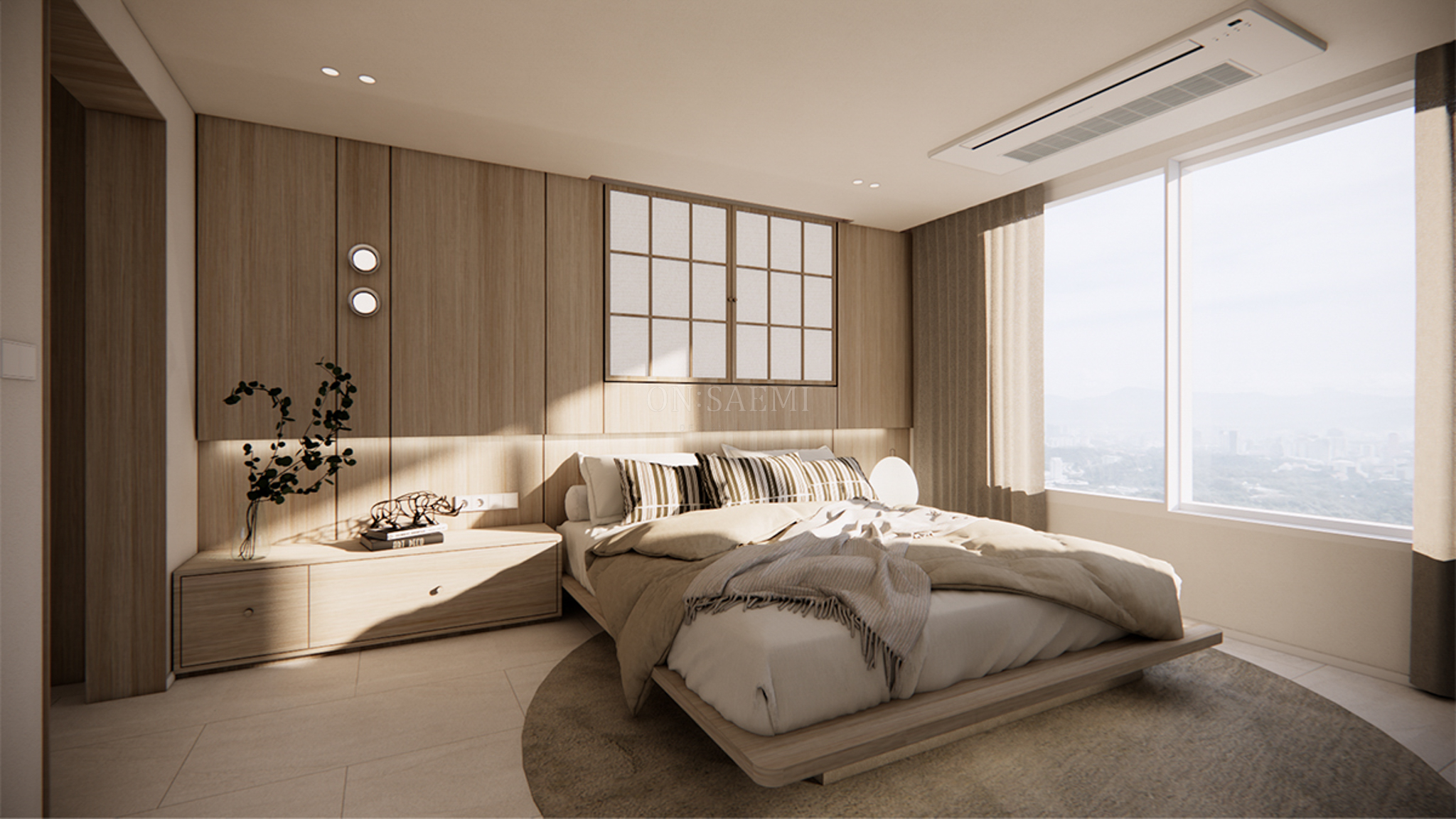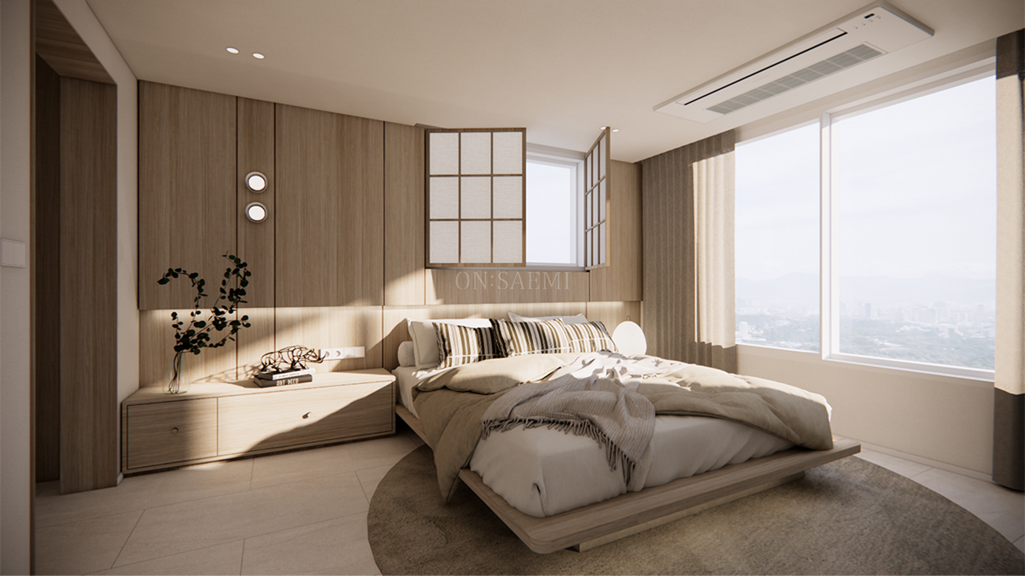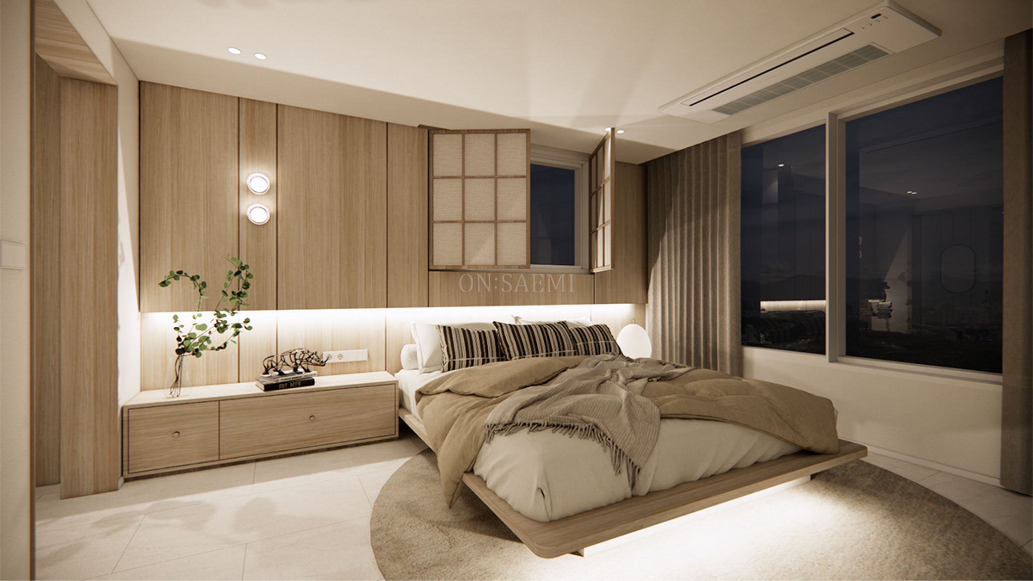 안방 _ 안방은 작은 창 벽을 전체 목공으로 시공한 후, 필름 마감 처리하여 고급스럽고 깔끔한 느낌을 주었습니다. 창 부분은 메지라인과 기존 창을 이중 간살창으로 디자인하고, 한지 아크릴을 마감한 양문형 창을 설치하여 젠스타일의 자연스러운 분위기와 평온함을 더했습니다. 이 디자인은 고요하고 세련된 느낌을 주며, 공간을 더욱 여유롭고 아늑하게 만듭니다. 또한, 포인트 벽등과 간접 조명을 활용하여 은은하면서도 세련된 분위기를 연출하며, 공간의 품격을 높였습니다.