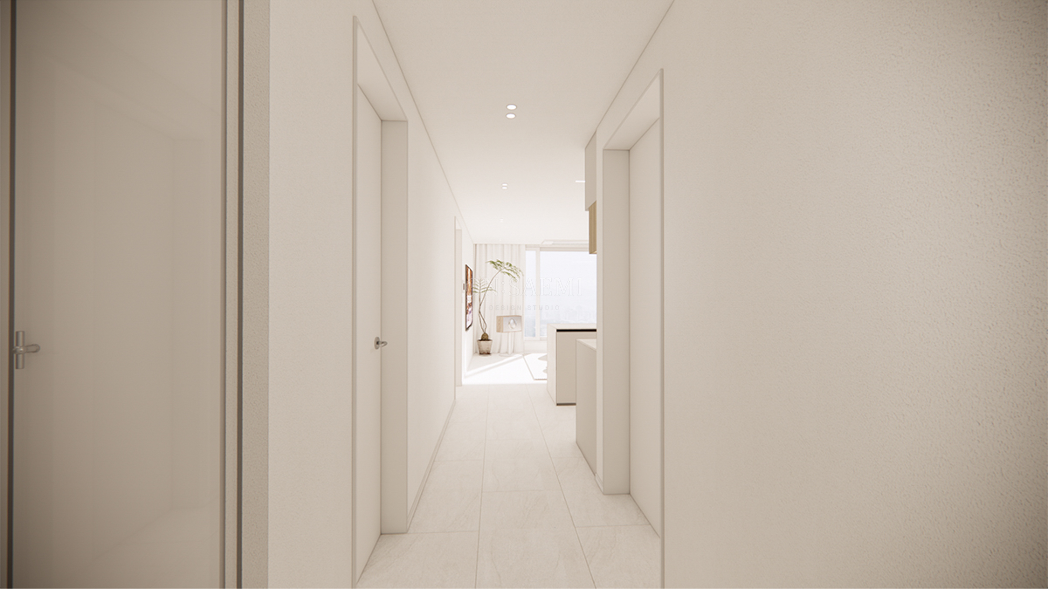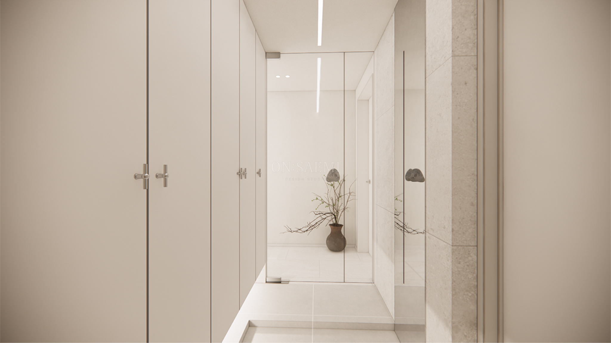 복도 _ 화이트 톤을 바탕으로 9mm 문선으로 시공하여 깨끗하고 절제된 느낌을 강조하며, 세련된 분위기를 연출합니다. 간결하면서도 깔끔한 디자인이 공간을 더욱 넓고 환하게 보이도록 만들어줍니다. 한쪽 끝에는 포인트 화분을 배치하여 자연 요소를 더하고, 이를 통해 실내와 외부 자연이 조화를 이루는 공간을 완성했습니다.