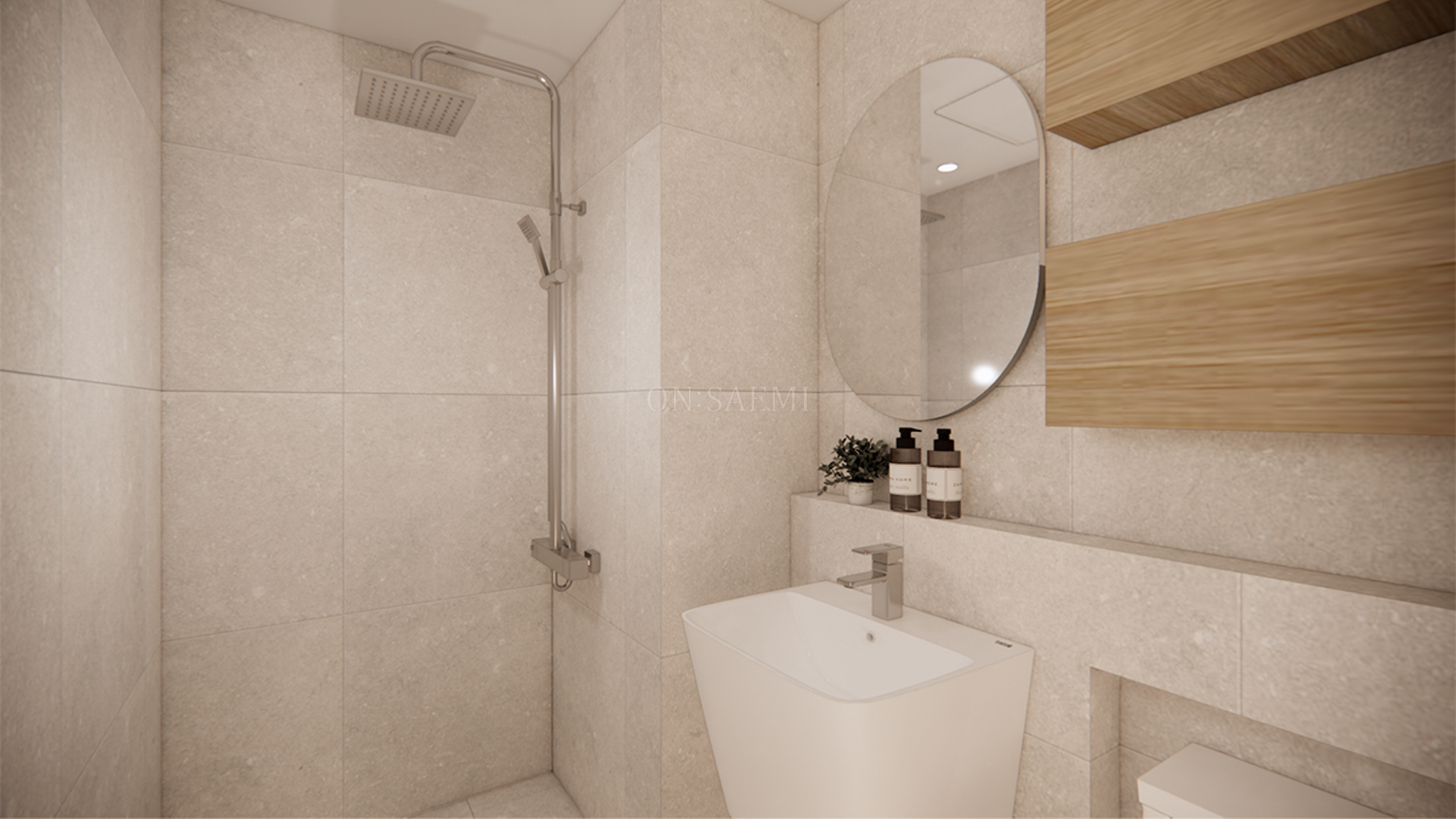 안방욕실 _ 안방 욕실은 바닥과 벽에 600x600mm 타일을 사용하여 일체감 있게 디자인되어 전체적인 공간에 통일감을 더합니다. 타일의 깔끔하고 세련된 느낌이 욕실을 더욱 넓어 보이게 하며, 공간에 자연스럽고 고급스러운 분위기를 제공합니다. 타원형 거울과 우드 선반을 추가하여, 이 집의 전반적인 디자인과 조화를 이루며 따뜻한 느낌을 더합니다. 이러한 디테일들이 어우러져 욕실은 기능성뿐만 아니라, 세련되고 편안한 분위기를 완성시킵니다.