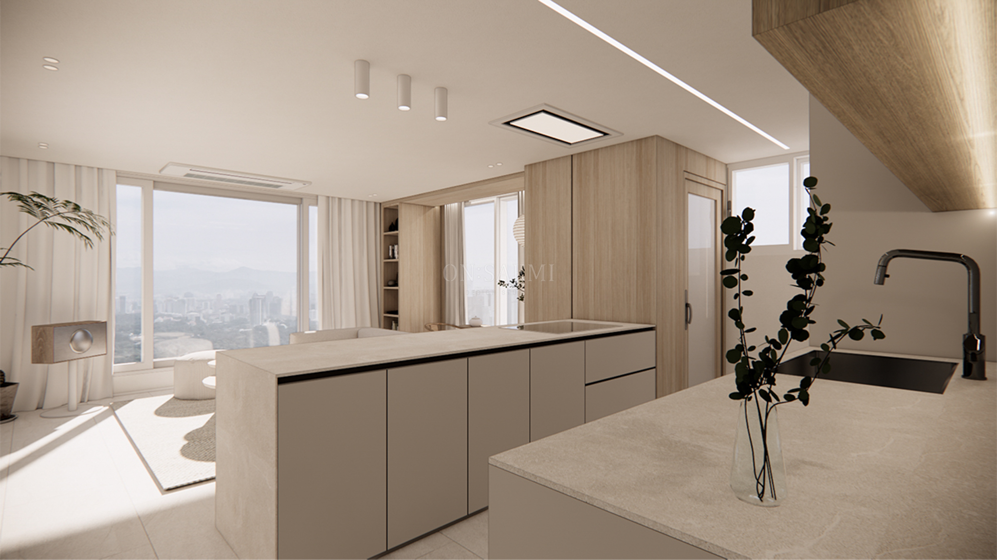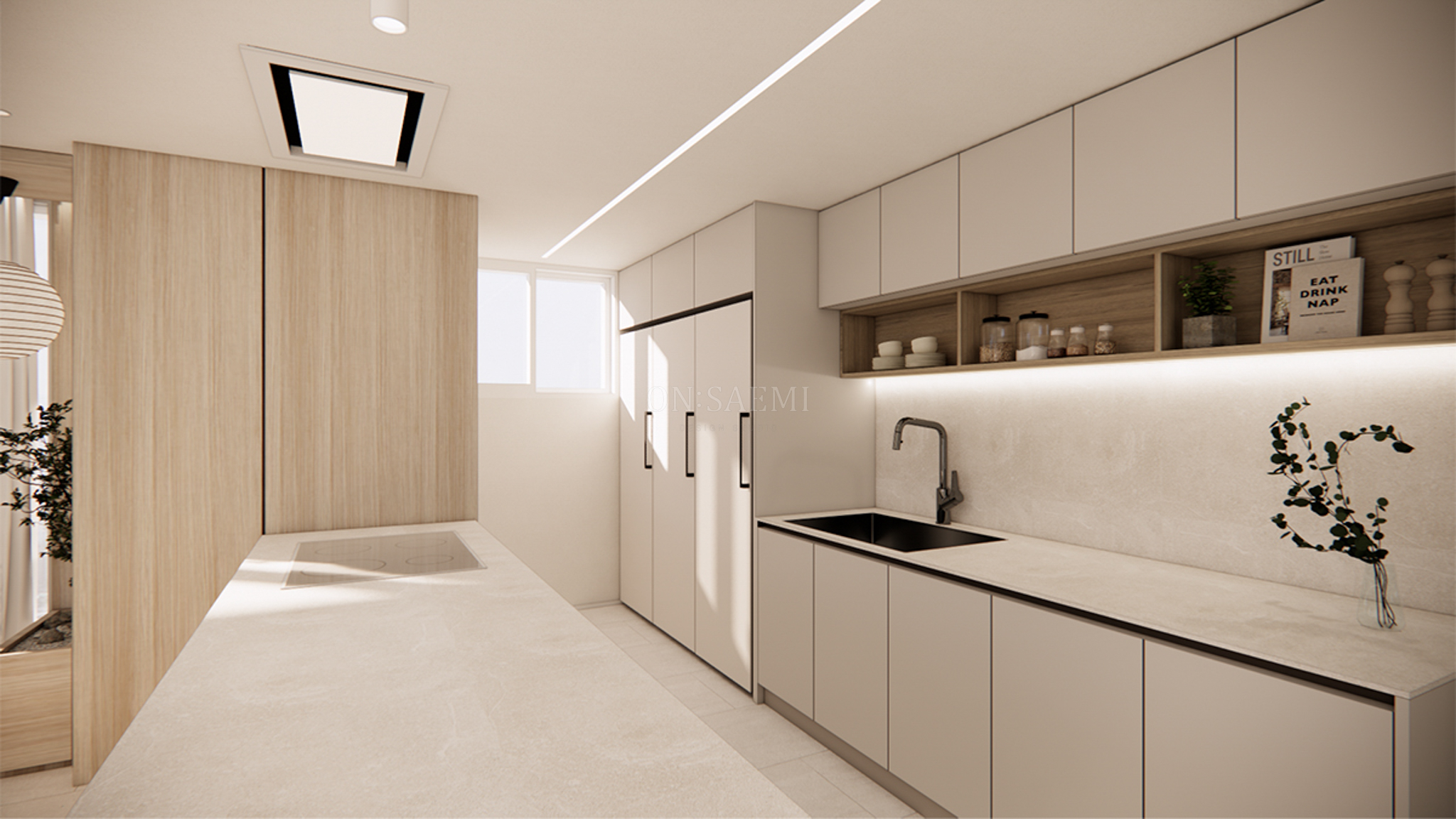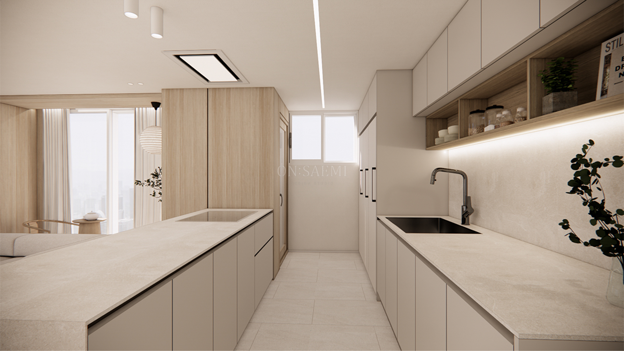 주방 _ 기존 구조를 최대한 활용하여, 냉장고 공간을 시작으로 싱크대와 벽, 상판을 세라믹으로 세련되게 연결했습니다. 상부장은 2단으로 디자인하여 우드 선반을 더해 공간에 따뜻함과 디자인적인 요소를 추가했습니다. 아일랜드는 기존 넓이보다 확장하여 공간을 더욱 넓고 효율적으로 활용할 수 있도록 제작했습니다. 천장 후드는 엘리카 후드를 매립형으로 깔끔하게 설치하여 깔끔하고 세련된 느낌을 강조합니다. 거실과 주방은 우드와 화이트 톤으로 연결되어 전체적으로 통일감 있는 조화를 이루며, 공간의 품격을 높였습니다.